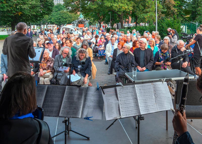 Am Abend versammelte sich die Reunion-Gemeinschaft mit öffentlichem Publikum im Kleinen Saal des Konzerthauses am Gendarmenmarkt, wo zwei Schauspieler – Hannelore Hoger und Burghart Klaußner – aus Ehebriefen von Moses und Fromet Mendelssohn lasen und Kammermusiker und eine Sängerin Werke von Fanny Hensel, Felix Mendelssohn Bartholdy und Kontantia Gourzi aufführten.