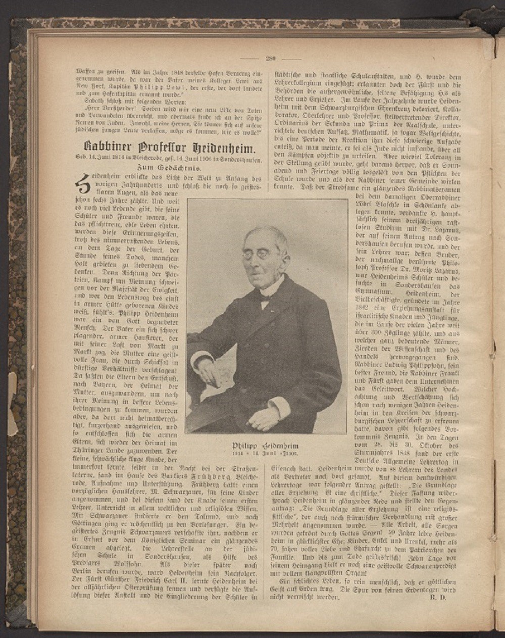 Heidenheim erblickte das Licht der Welt zu Anfang des vorigen Jahrhunderts und schloß die noch so geistesklaren Augen, als das neue schon sechs Jahre zählte. Und weil es noch viel Lebende gibt, die seine Schüler und Freunde waren, die das pflichttreue und edle Leben ehrten, werden diese Erinnerungszeilen, trotz des nimmerrastenden Lebens, an dem Tage der Geburt, der Stunde seines Todes, manchen Halt gebieten zu liebendem Gedenken. Denn Richtung der Parteien, Kampf um Meinung schweigen vor der Majestät der Ewigkeit, und wer den Lebensweg des einst in armer Hütte geborenen Kindes weiß, fühlt‘s: Philipp Heidenheim war ein von Gott begnadeter Mensch. Der Vater, ein sich schwer plagender, armer Hausierer, der mit seiner last von Markt zu Markt zog, die Mutter eine geistvolle Frau, die durch Schicksal in dürftige Verhältnisse verschlagen! Da faßten die Eltern den Entschluß, nach Bayern , der Heimat der Mutter auszuwandern, um nach ihrer Meinung in bessere Lebensverhältnisse zu kommen, wurden aber, da dort nicht heimatberechtigt, kurzerhand ausgewiesen, und so entschlossen sich die armen Eltern, sich wieder der Heimat im Thüringer Lande zuzuwenden. Der kleine, schwächliche Knabe, der immerfort lernte, selbst in der Nacht bei der Straßenlaterne, fand im Hause des Bankiers F r ü b e r g, Bleicherode, Aufnahme und Unterstützung. Frühberg hatte einen vorzüglichen Hauslehrer, M. Schwarzauer, für seine Kinder angenommen, und bei diesem fand der Knabe seinen ersten Lehrer, Unterricht in allen weltlichen und religiösen Wissen. Mit Schwarzauer studierte er den Talmud, und nach Göttingen ging er wöchentlich zu den Vorlesungen. Ein begeistertes Zeugnis Schwarzauers verschaffte ihm, nachdem er in Erfurt vor dem Königlichen Seminar ein glänzendes Examen abgelegt hatte, die Lehrerstelle an der jüdischen Schule in Sondershausen, als Hilfe des Predigers Wolfssohn. Als dieser später nach Berlin berufen wurde, ward Heidenheim sein Nachfolger. Der Fürst Günther Friedrich Carl II. lernte heidenheim bei der alljährlichen Osterprüfung kennen und verfügte die Auflösung dieser Anstalt und die Eingliederung der Schüler in städtische und staatliche Schulanstalten, und H. wurde dem Lehrerkollegium eingefügt; erkannten doch der Fürst und die Behörden die außergewöhnliche, seltene Befähigung H.s als Lehrer und Erzieher. Im Laufe der Jahrzehnte wurde Heidenheim mit dem Schwarzburgischen Ehrenkreuz dekoriert, Kollaborator, Oberlehrer und Professor, stellvertretender Direktor, Ordinarius der Sekunda und Prima der Realschule, unterrichtete deutschen Aufsatz, Mathematik, ja sogar Weltgeschichte, bis eine Periode der Reaktion ihm diese schwierige Aufgabe entriß, da man meinte, er sei als Jude nicht imstande, über all den Kämpfen objektiv zu urteilen. Aber wieviel Toleranz in der Stellung geübt wurde, geht daraus hervor, daß er Sonnabend und Feiertage völlig losgelöst von den Pflichten der Schule wurde und als der Rabbiner seiner Gemeinde wirken konnte. Daß der Strebsame ein glänzendes Rabbinatsexamen bei dem damaligen Oberrabbiner Löbel in Schönlanke ablegen konnte, verdankte H. hauptsächlich seinem dreijährigen rastlosen Studium mit Dr. Lazarus, der auf seinen Antrag nach Sondershausen berufen wurde, und der sein Lehrer war; dessen Bruder, der nachmalige berühmte Philosoph Professor Dr. Moritz Lazarus, war Heidenheims Schüler und besuchte in Sondershausen das Gymnasium. Heidenheim, der Vielbeschäftigte, gründete im Jahre 1848 eine Erziehungsanstalt für israelitische Knaben und Jünglinge, die im Laufe der vielen Jahre weit über 300 Zöglinge zählte, und aus welcher ganz bedeutende Männer, Zierden der Wissenschaft und des Handels hervorgegangen sind. Rabbiner Ludwig Philippsohn, sein bester Freund, die Rabbiner Frankl und Fürst gaben dem Unternehmen das Geleitwort. Welcher Hochachtung und Wertschätzung sich schon nach wenigen Jahren Heidenheim in den Kreisen der Lehrerschaft zu erfreuen hatte, davon gibt folgendes Vorkommnis Zeugnis. In den Tagen vom 28. bis 30. Oktober des Sturmjahres 1948 fand der erste deutsche allgemeine Lehrertag in Eisenach statt .Heidenheim wurde von 88 Lehrern des Landes als Vertreter nach dort gesandt. Auf diesem merkwürdigen Lehrertage war folgender Antrag gestellt: „ Die Grundlage aller Erziehung ist eine christliche.“ Dieser Fassung widersprach Heidenheim in glänzender Rede und stellte den Gegenantrag: „ Die Grundlage aller Erziehung ist eine religiössittliche“, der auch nach stürmischer Verhandlung mit großer Mehrheit angenommen wurde. - Alle Arbeit, alle Sorgen wurden gekrönt durch Gottes Segen! 59 Jahre lebte Heidenheim in glücklicher Ehe; Kinder, Enkel, Urenkel, mehr als 70, sahen voller Liebe und Ehrfurcht zu dem Patriarchen der Familie. Und bis zum Tode geistesfrisch! Zehn Tage vor seinem Heimgang hielt er noch eine geistvolle Schwanenpredigt mit vollem klangvollsten Organ!
