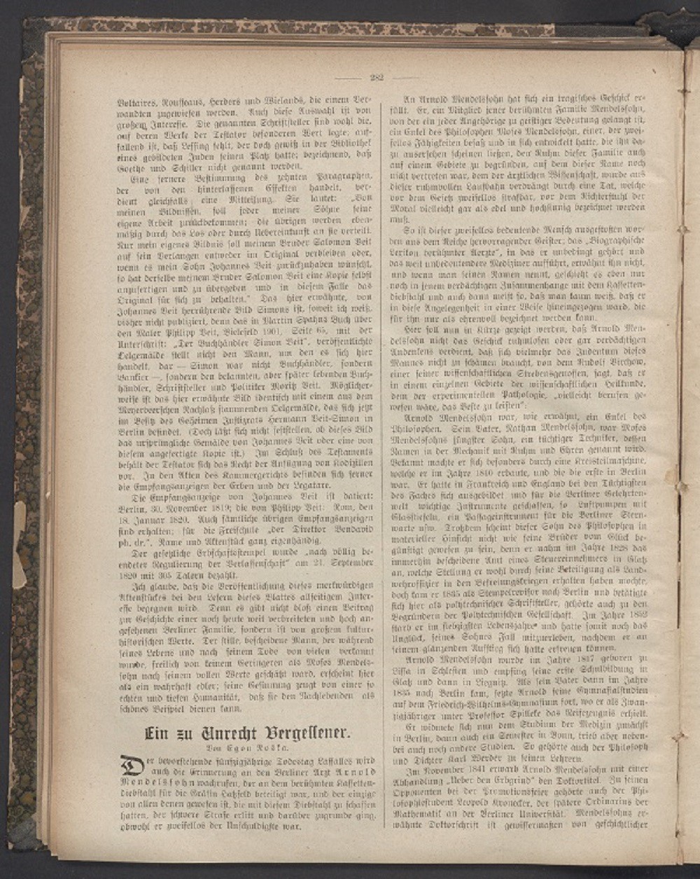 An Arnold Mendelssohn hat sich ein tragisches Geschick erfüllt. Er, ein Mitglied der berühmten Familie Mendelssohn, von der ein jeder Angehöriger zu geistiger Bedeutung gelangt ist, ein Enkel des Philosophen Mendelssohn, einer, der zweifellos Fähigkeiten besaß und in sich entwickelt hatte, die ihn dazu ausersehen scheinen ließen, den Ruhm dieser Familie auch auf einem Gebiete zu begründen, auf dem dieser Name noch nicht vertreten war, dem der ärztlichen Wissenschaft, wurde aus dieser ruhmvollen Laufbahn verdrängt durch eine Tat, welche vor dem Gesetz zweifellos strafbar, vor dem Richterstuhl der Moral vielleicht gar als edel und hochsinnig bezeichnet werden muß.