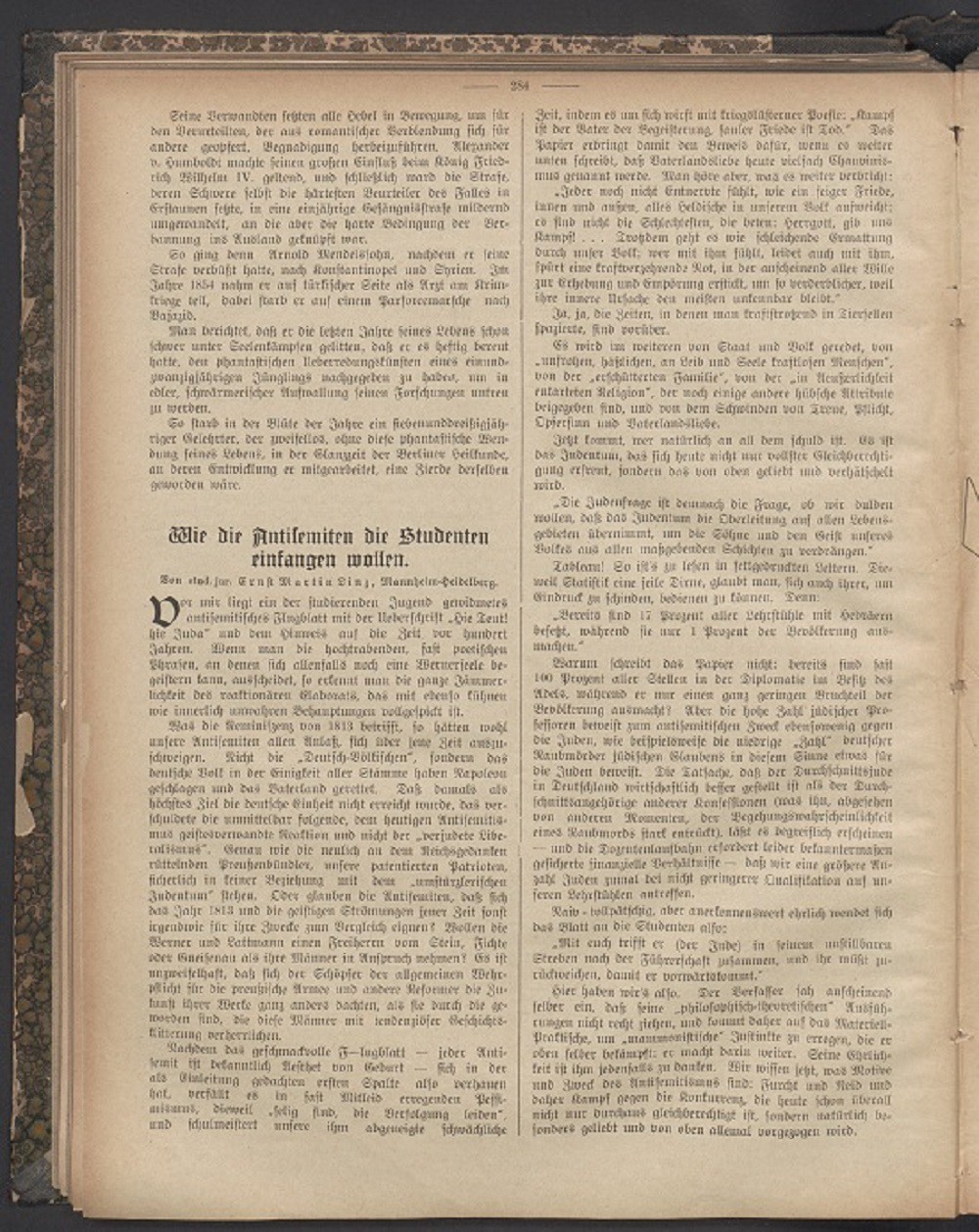 Gleichwohl ist auch hier trotz der größten Anstrengungen des Antisemitismus eine starke Gegnerschaft gegen diesen bereits deutlich erkennbar. So bleibt denn zu hoffen, daß der gesunde Sinn unserer Studenten den Antisemitismus aus Reinlichkeitsgründen ablehnt und als das erkennt, was er in Wirklichkeit ist: als eine charakterlose Spekulation auf die niedrigsten menschlichen Instinkte.