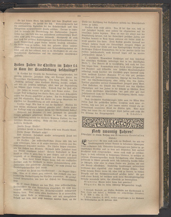 P. Corssen hat kürzlich die Vermutung ausgesprochen, der jüdische Historiker Josephus stehe als Anreger hinter der Neronischen Christenverfolgung. Der kurze Bericht, den die „Vossische Zeitung“ über Corssens Vortrag brachte, enthält, wie mir ein Zuhörer bestätigte, alles, was zur Begründung der kühnen These dienen sollte. Danach liegt der Fall also: