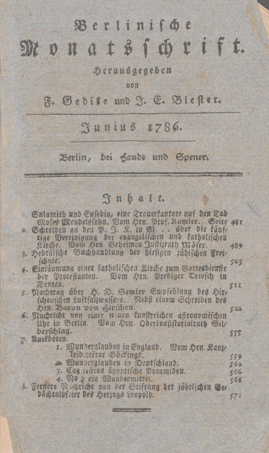 Berlinische Monatsschrift Inhaltsverzeichnis für Juni 1786