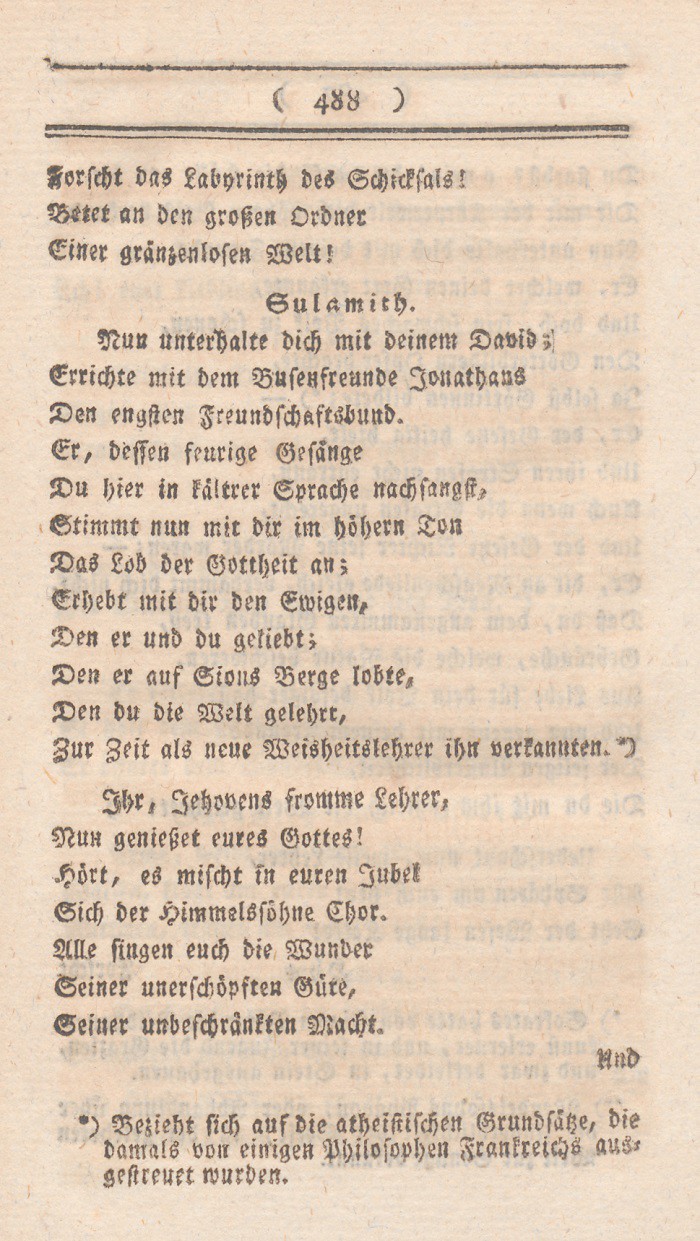 **) Dieses bezieht sich insonderheit auf die Prinzessinn Ferdinand, Gemahlinn des jüngsten königlichen Bruders, und auf die Herzoginn von Kurland, welche damals mit dem Herzoge, ihrem Herrn Gemahl, in Berlin lebte, und auf derselben Schwester, die Frau von der Recke, geborene Reichsgräfinn von Medem, welche sich unter dem Namen Elisa durch ihre Gedichte berühmt gemacht hat.