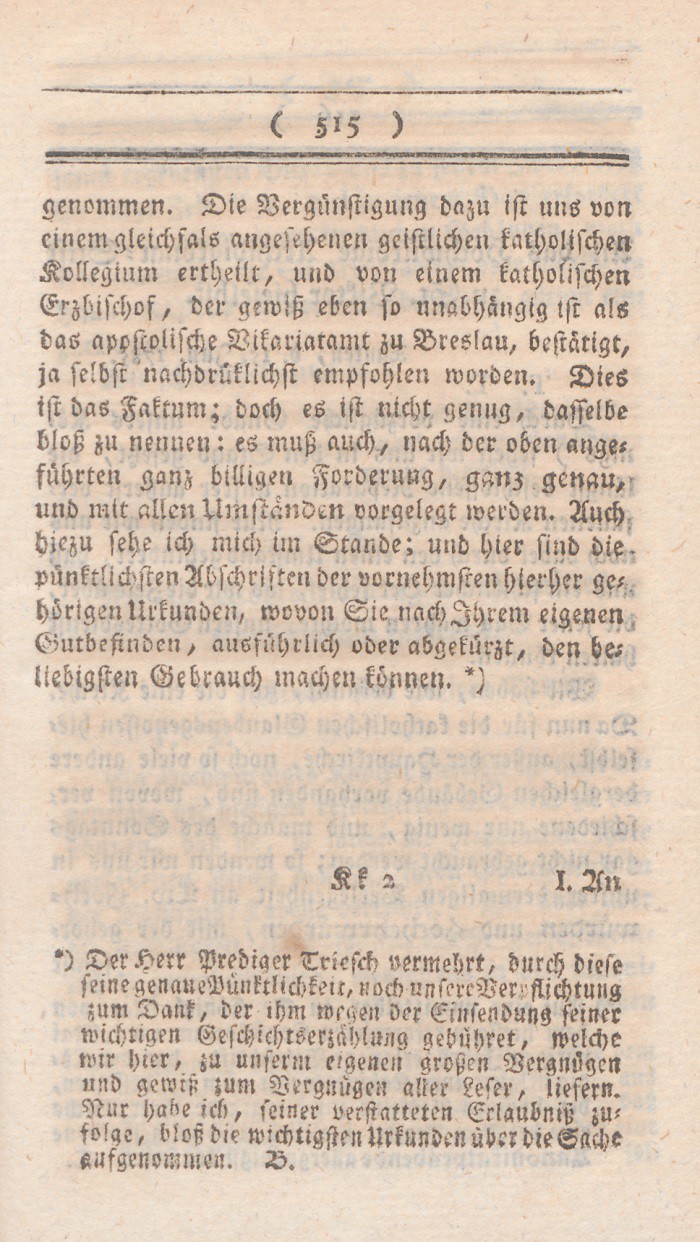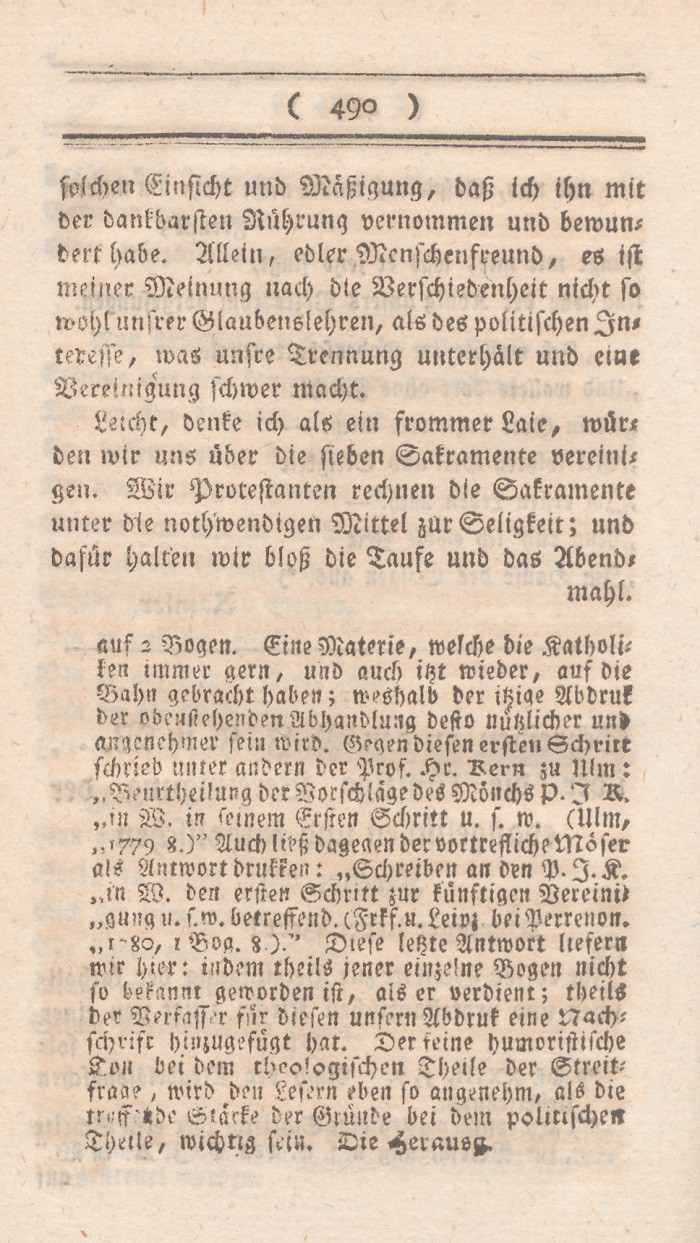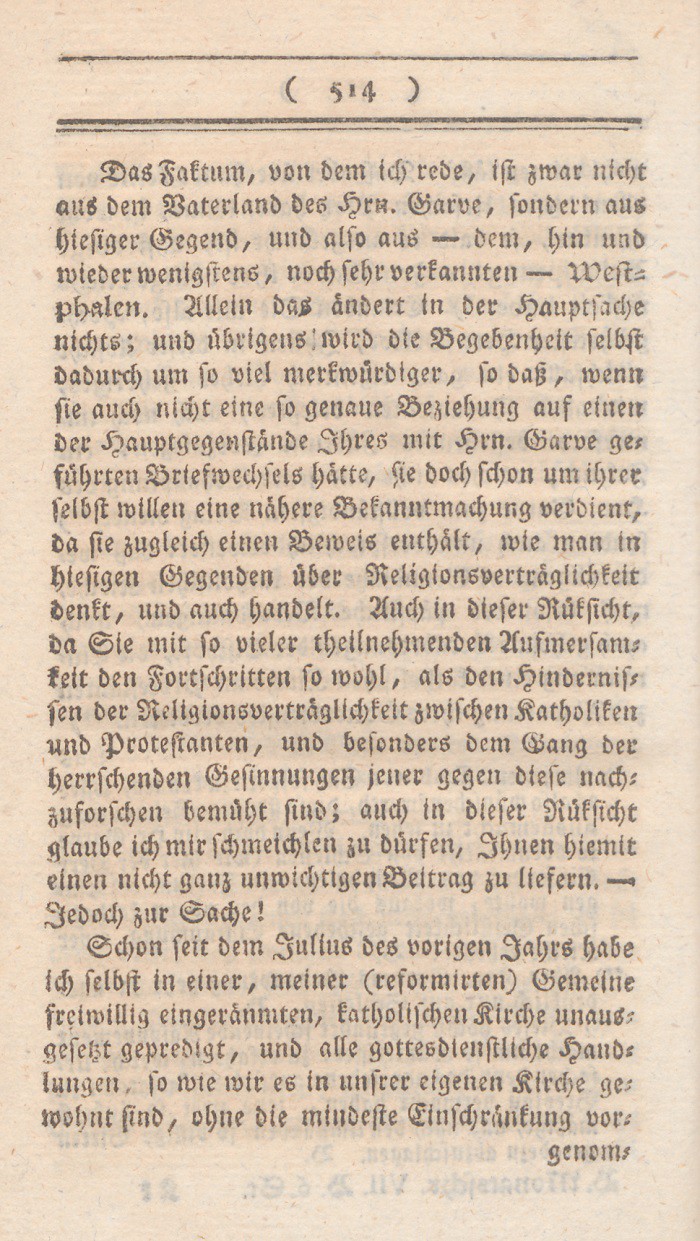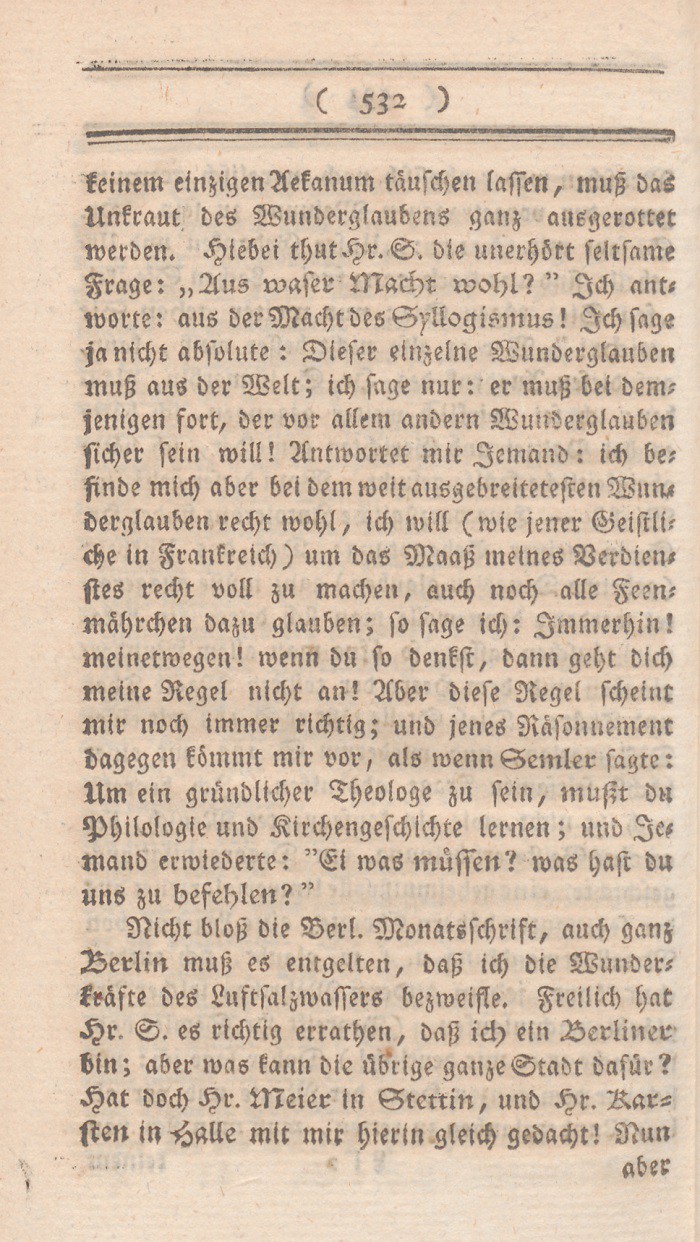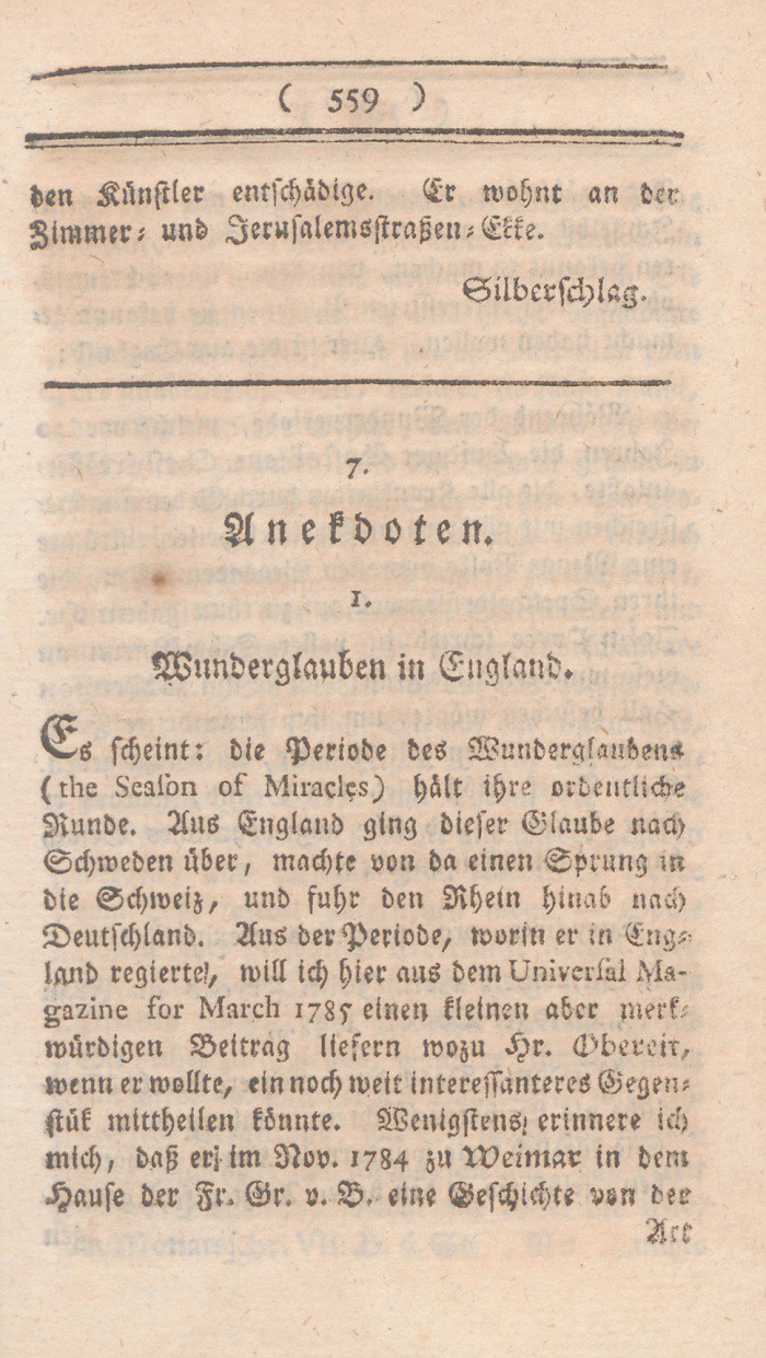 Es scheint: die Periode des Wunderglaubens (the Season of Miracles) hält ihre ordentliche Runde. Aus England ging dieser Glaube nach Schweden über, machte von da einen Sprung in die Schweiz, und fuhr den Rhein hinab nach Deutschland. Aus der Periode, worin er in England regierte, will ich hier aus dem Universal Magazine for March 1785 einen kleinen aber merkwürdigen Beitrag liefern wozu Hr. Obereit, wenn er wollte, ein noch weit interessanteres Gegenstük mittheilen könnte. Wenigstens erinnere ich mich, daß er im Nov. 1784 zu Weimar in dem Hause der Fr. Gr. v. B. eine Geschichte von der