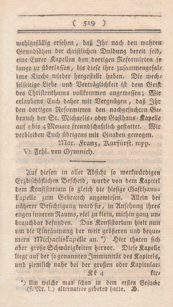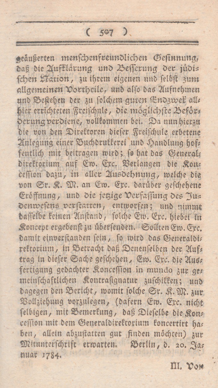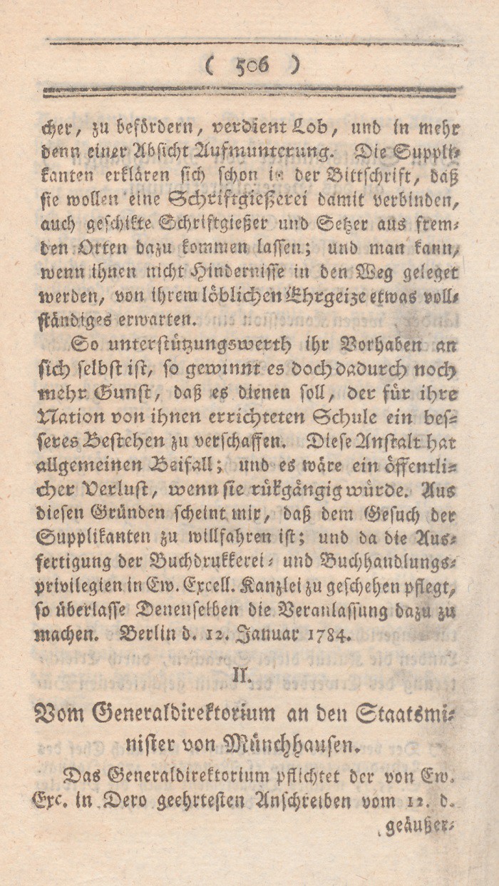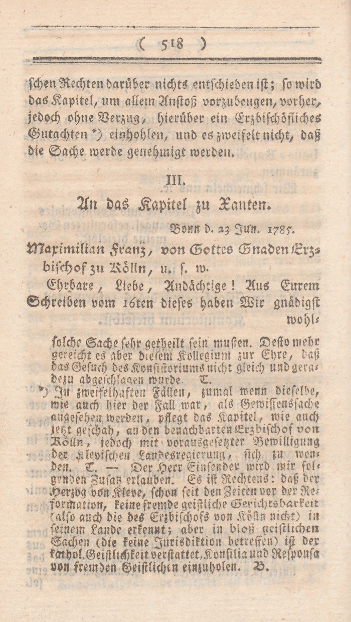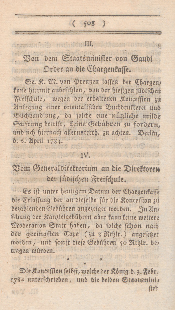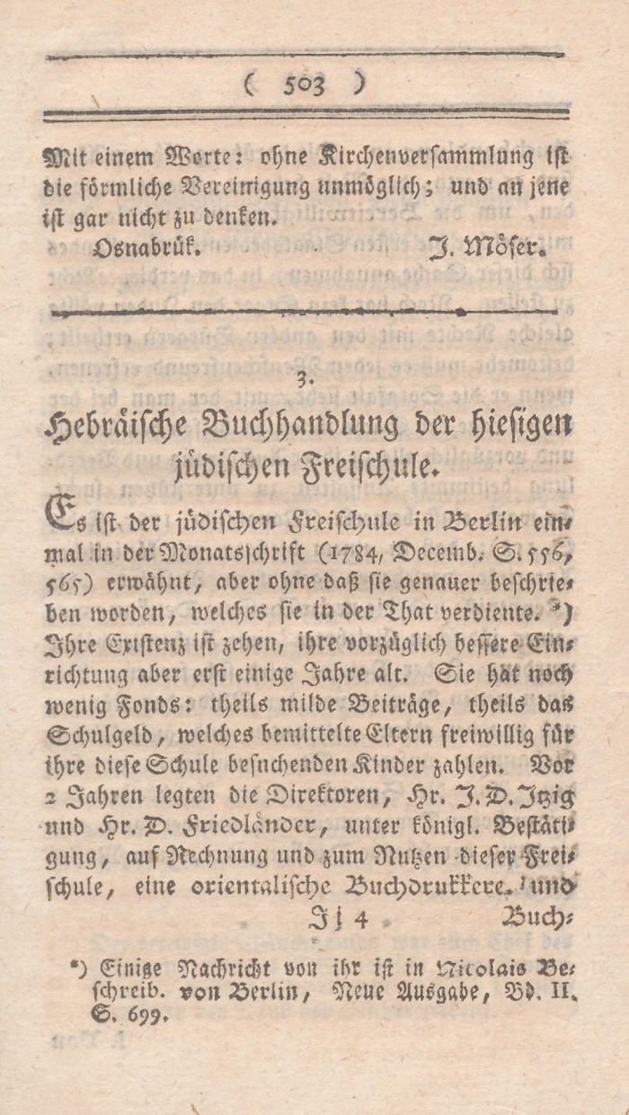 III. Noch hat sich ein patriotischer geschikter Mitbürger entschlossen, eine Frucht seines musikalischen Fleißes und Talents diesem Institute zu weihen, um den wohlthätigen Endzwek der Stiftung noch zu vergrößern. Wir rükkenhier den Aufsatz des Hern. Zelters ein, bitten alle Herausgeber von Journalen um weitere Bekanntmachung, und wünschen und hoffen durch die Pränumeration auf das angekündigte Werk eine beträchtlicheVermehrung des Fonds der wohlthätigen Stiftung.