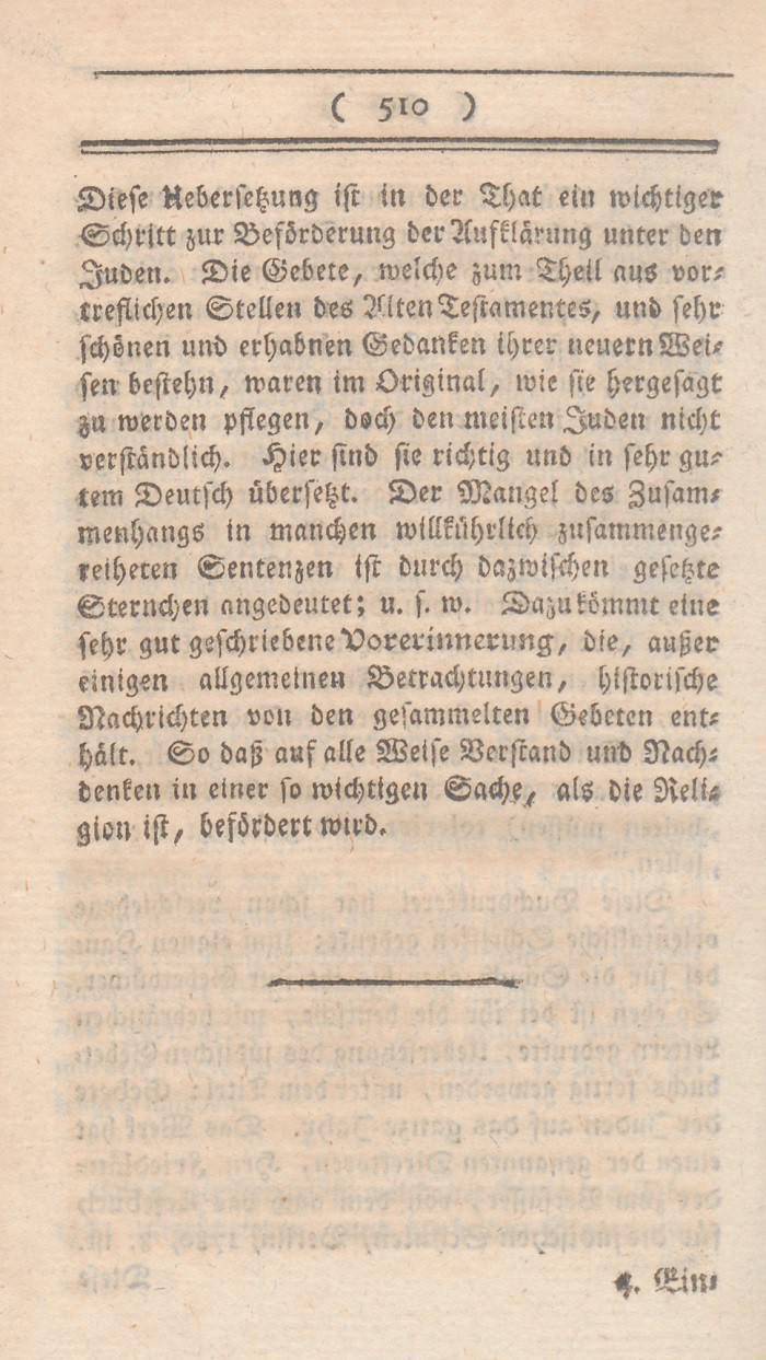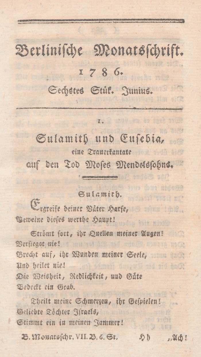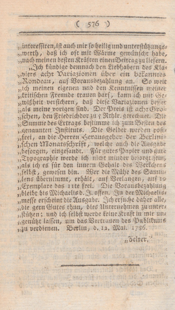 Ich kündige demnach den Liebhabern des Klaviers acht Variazionen über ein bekannts Rondeau, auf Vorausbezahlung an. So weit ich meinen eigenen und den Kenntnissen meiner kritischen Freunde trauen darf, kann ich mit Gewißheit versichern, daß diese Variazionen besser als meine vorigen sind. Der Preis ist acht Groschen, den Friedrichsdor zu 5 Rthlr. gerechnet. Die Summe des Ertrags bestimme ich zum Besten des genannten Instituts. Die Gelder werden postfrei, an die Herren Herausgeber der Berlinischen Monatsschrift, welcheauch die Ausgabe besorgen, eingesandt. Für gutes Papier und gute Typographie werde ich nicht minder besorgt sein, als ich es für den innern Gehalt des Werkchens selbst, gewesen bin. Wer die Mühe des Sammelns übernimmt, erhält, auf Verlangen, auf 10 Exemplare das 111te frei. Die Vorausbezahlung bleibt bis Michaelis d.J. offen. Inder Michaelismesse erscheint die Ausgabe. Ich ersuche daher alle, die gern Gutes thun, dies Unternehmen zu unterstützen; und ich selbst werde keine Kraft in mir ungenützt lassen, um das Vertrauen des Publikums zu verdienen. Berlin, d. 13. Mai. 1786