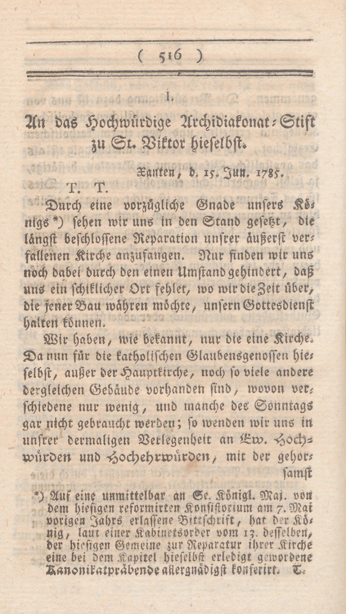 durch die reichlichen Beiträge edelmüthiger Menschenfreunde von allen Ständen und aus allen Gegenden, überhaupt eingekommen (nach Brandenburg. Curant berechnet) die Summe von ... 6580 Thlr. 5 Gr. Von dieser Summe sind der Ankauf des Papiers für den Druk der Denkschrift (womit man itzt beschäftigt ist), die Feirung des ersten Festes, und manche, einzeln kleine, im ganzen aber beträchtliche Ausgaben, bestritten worden; und das Hauptkapital liefert unablöslich aufs künftige die Zinsen zu den Kosten der jährlichen Gedächtnißfeier. Die genaue Berechnung von allem diesen wird die Gesellschaft dem Publikum in der Denkschrift vorlegen. Hier wird zugleich bestimt angegeben, aus welchen Orten und von welchen Personen (diejenigen ausgenommen, welche die Nennung ihres Namens ausdrüklich verbeten haben) die Beiträge eingekommen sind; da bis itzt in den kurzen Nachrichten der Monatsschrift nur im allgemeinen konnte angegeben werden, was aus einer gesamten Provinz, z.B. Braunschweig, Schlesien, Ost- und westpreußen, eingesendet worden.