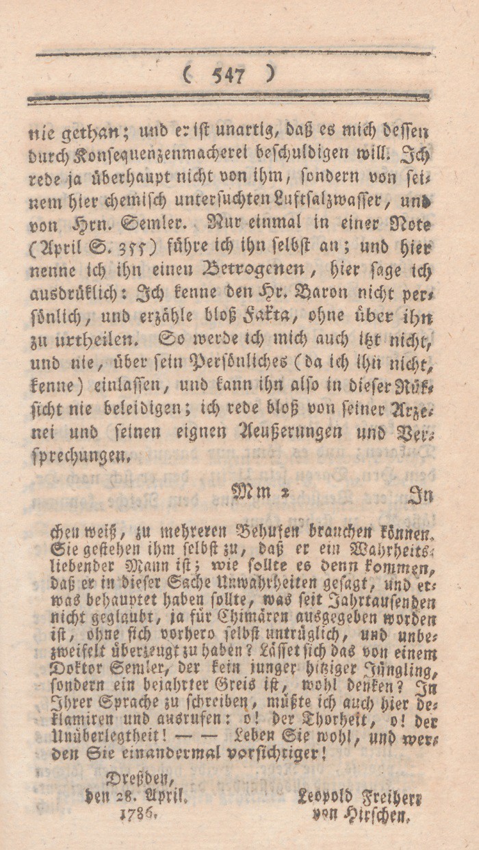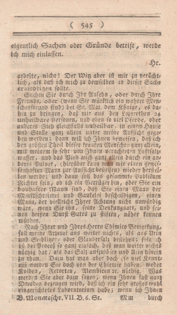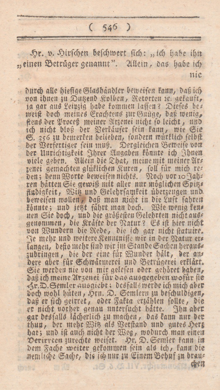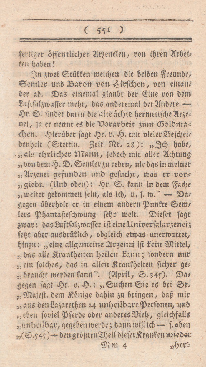 In zwei Stükken weichen die beiden Freunde, Semler und und Baron von Hirschen, von einander ab. Das einemal glaubte der Eine von dem Luftsalzwasser mehr, das anderemal der Andere. – Hr. S. findet darin die alte ächte hermetische Arzenei, ja er nennt es die Vorarbeit zum Goldmachen. Hierüber sagt Hr. v. H.mit vieler Bescheidenheit (Stettin, Zeit. Nr. 28): „Ich habe als ehrlicher Mann, jedoch mit aller Achtung von dem H.D. Semler zu reden, nie das in meiner Arzenei gefunden und gesucht, was er vorgiebt. (Und oben): Hr. S. kann in dem Fache weiter gekommen sein, als ich, u.s.w.“ – Dagegen überholt er in einem anderen Punkte Semlers Phantasieschwung sehr weit. Dieser sagt zwar: das Luftsalzwasser ist eine Universalarzenei; setzt aber ausdrüklich, obgleich etwas unerwartet, hinzu: „eine allgemeine Arzenei ist kein Mittel, das alle Krankheiten heilen kann; sondern nur ein solches, das in allen Krankheiten sicher gebraucht werden kann.“ (April, S. 345). Dagegen sagt Hr. v. H.: „Suchen Sie es bei Sr. Majest. dem Könige dahin zu bringen, daß mir aus den Lazarethen 24 unheilbare Personen, und eben soviel Pferde oder anderes Vieh, gleichfalls unheilbar, gegeben werde; dann will ich – s. oben (S. 545) – den größten Theil dieser Kranken wieder