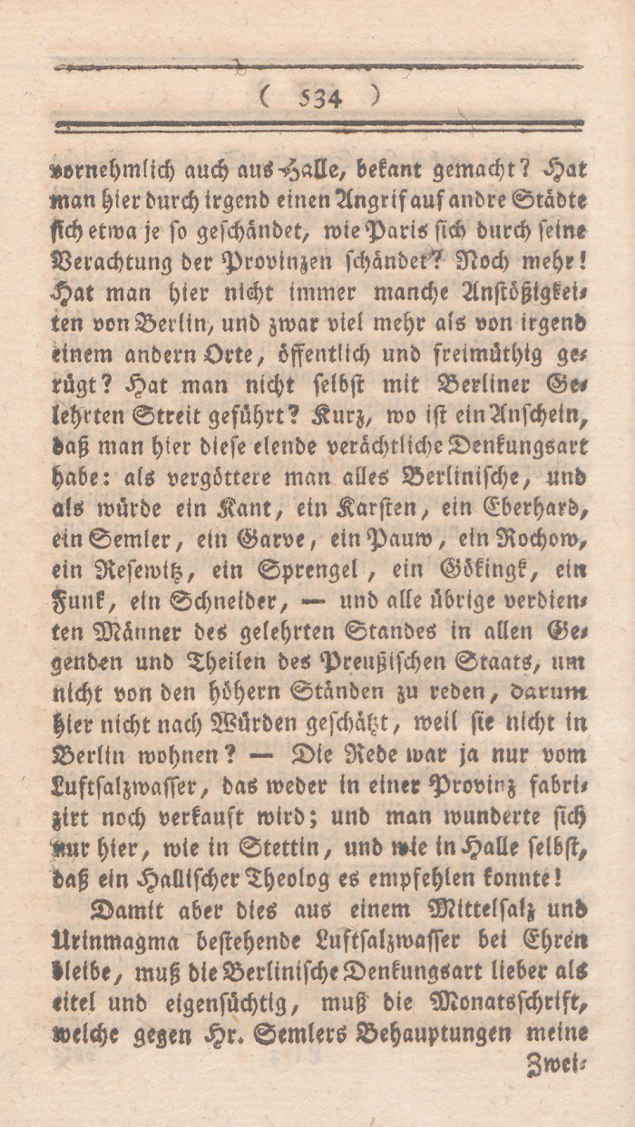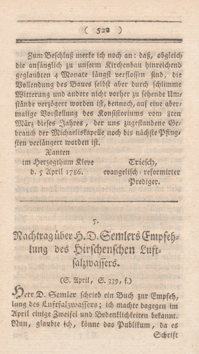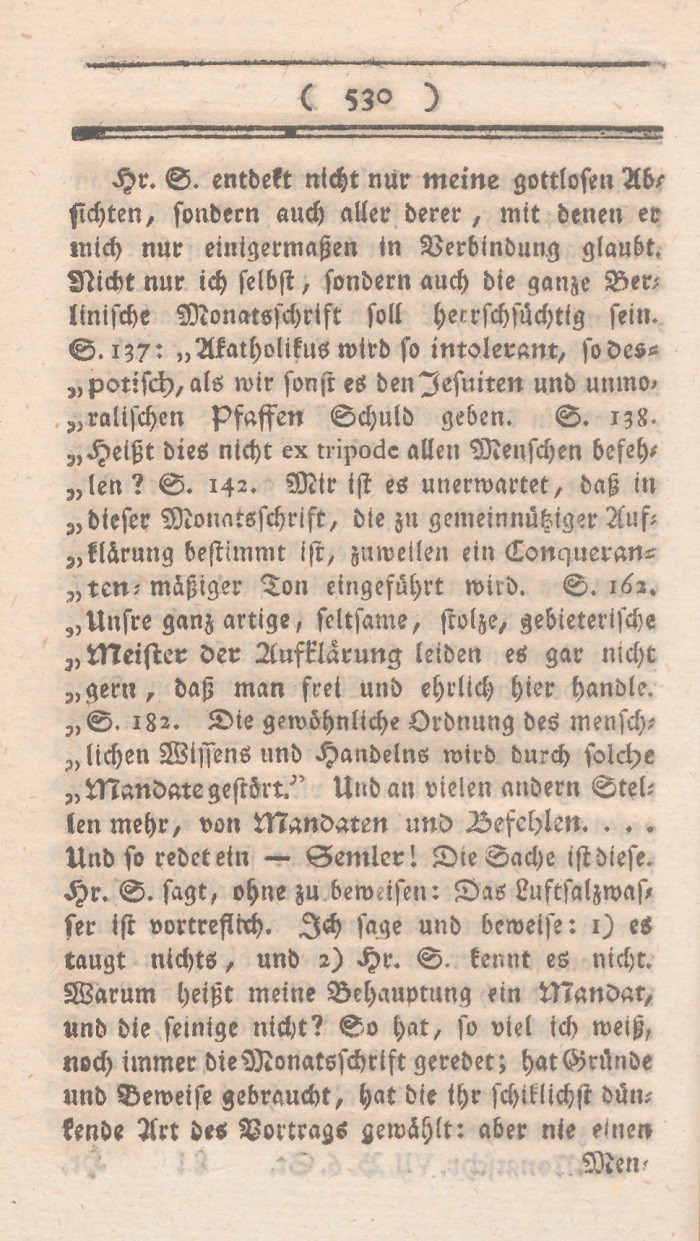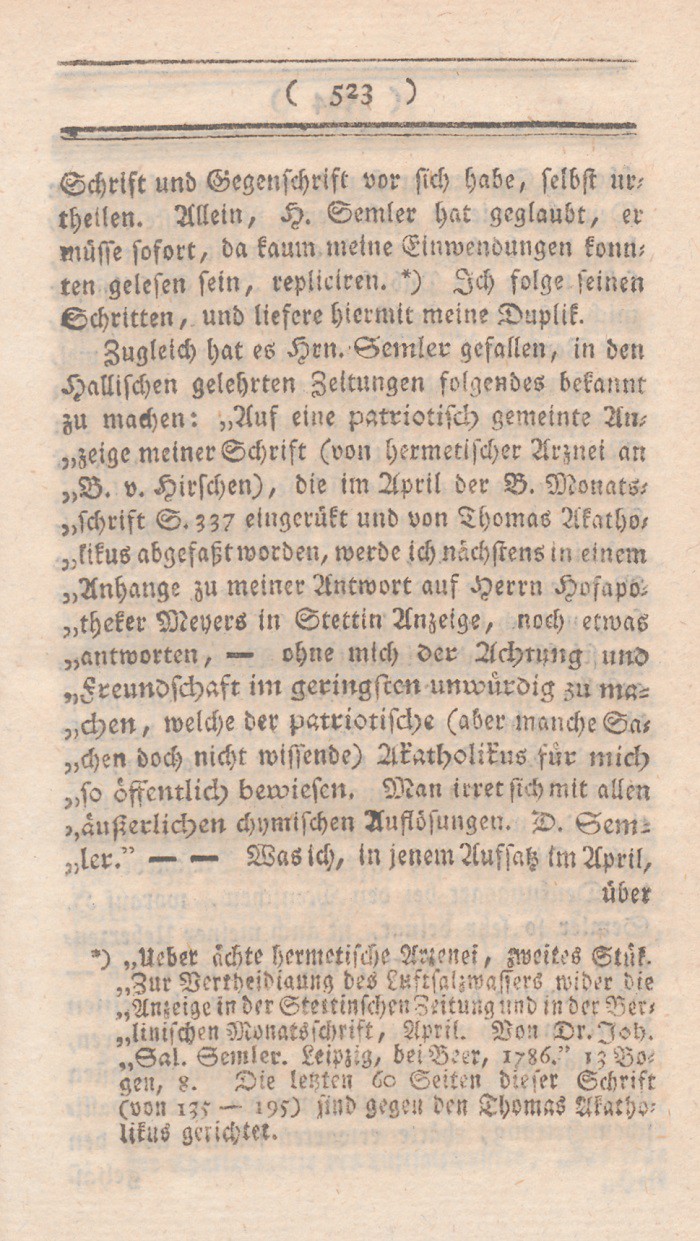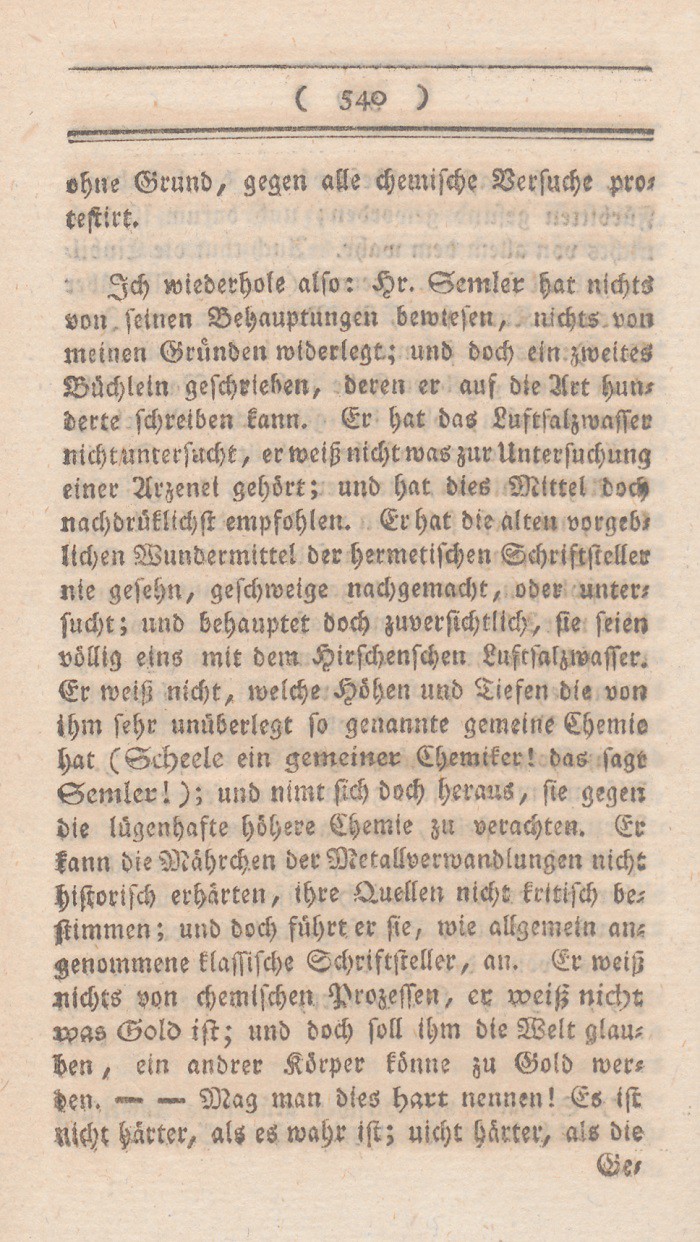 In zwei Stükken weichen die beiden Freunde, Semler und und Baron von Hirschen, von einander ab. Das einemal glaubte der Eine von dem Luftsalzwasser mehr, das anderemal der Andere. – Hr. S. findet darin die alte ächte hermetische Arzenei, ja er nennt es die Vorarbeit zum Goldmachen. Hierüber sagt Hr. v. H.mit vieler Bescheidenheit (Stettin, Zeit. Nr. 28): „Ich habe als ehrlicher Mann, jedoch mit aller Achtung von dem H.D. Semler zu reden, nie das in meiner Arzenei gefunden und gesucht, was er vorgiebt. (Und oben): Hr. S. kann in dem Fache weiter gekommen sein, als ich, u.s.w.“ – Dagegen überholt er in einem anderen Punkte Semlers Phantasieschwung sehr weit. Dieser sagt zwar: das Luftsalzwasser ist eine Universalarzenei; setzt aber ausdrüklich, obgleich etwas unerwartet, hinzu: „eine allgemeine Arzenei ist kein Mittel, das alle Krankheiten heilen kann; sondern nur ein solches, das in allen Krankheiten sicher gebraucht werden kann.“ (April, S. 345). Dagegen sagt Hr. v. H.: „Suchen Sie es bei Sr. Majest. dem Könige dahin zu bringen, daß mir aus den Lazarethen 24 unheilbare Personen, und eben soviel Pferde oder anderes Vieh, gleichfalls unheilbar, gegeben werde; dann will ich – s. oben (S. 545) – den größten Theil dieser Kranken wieder