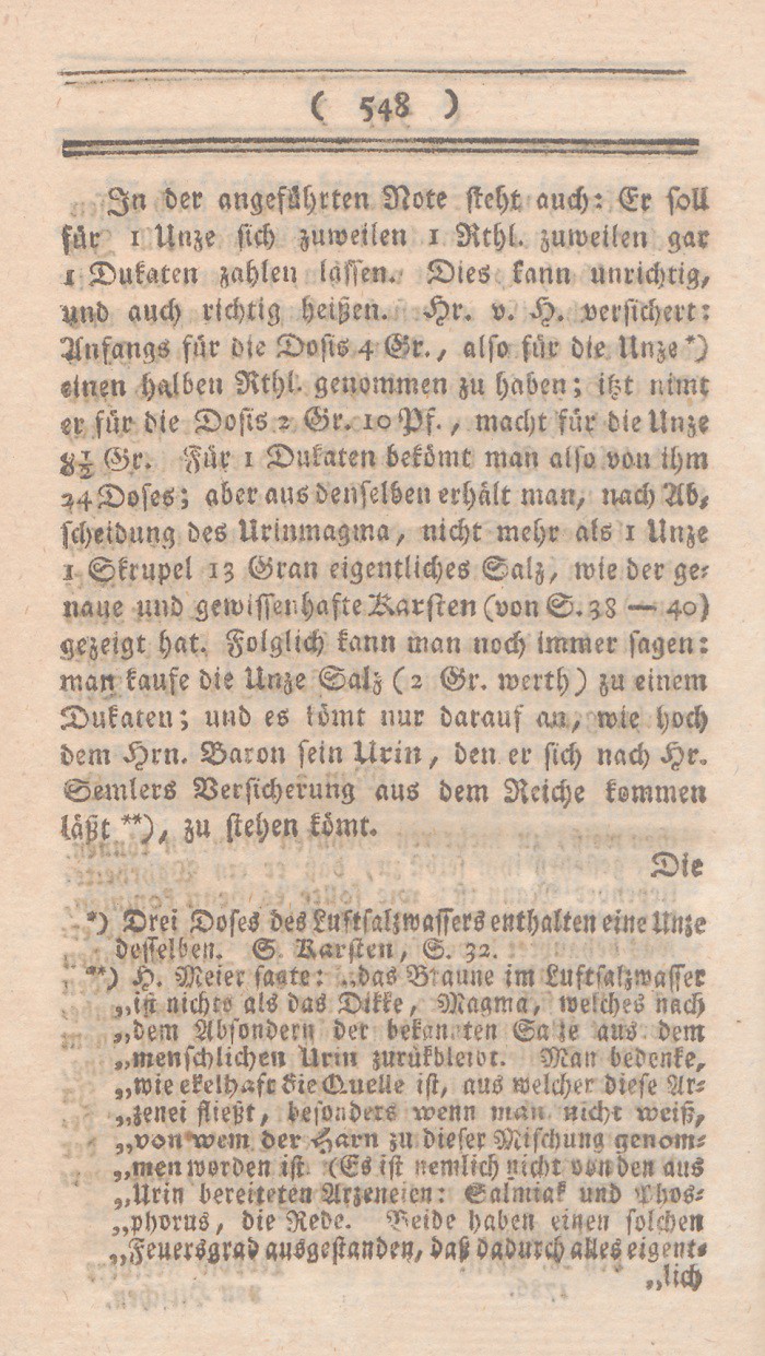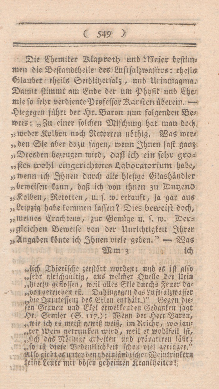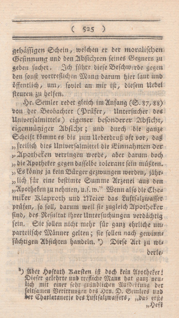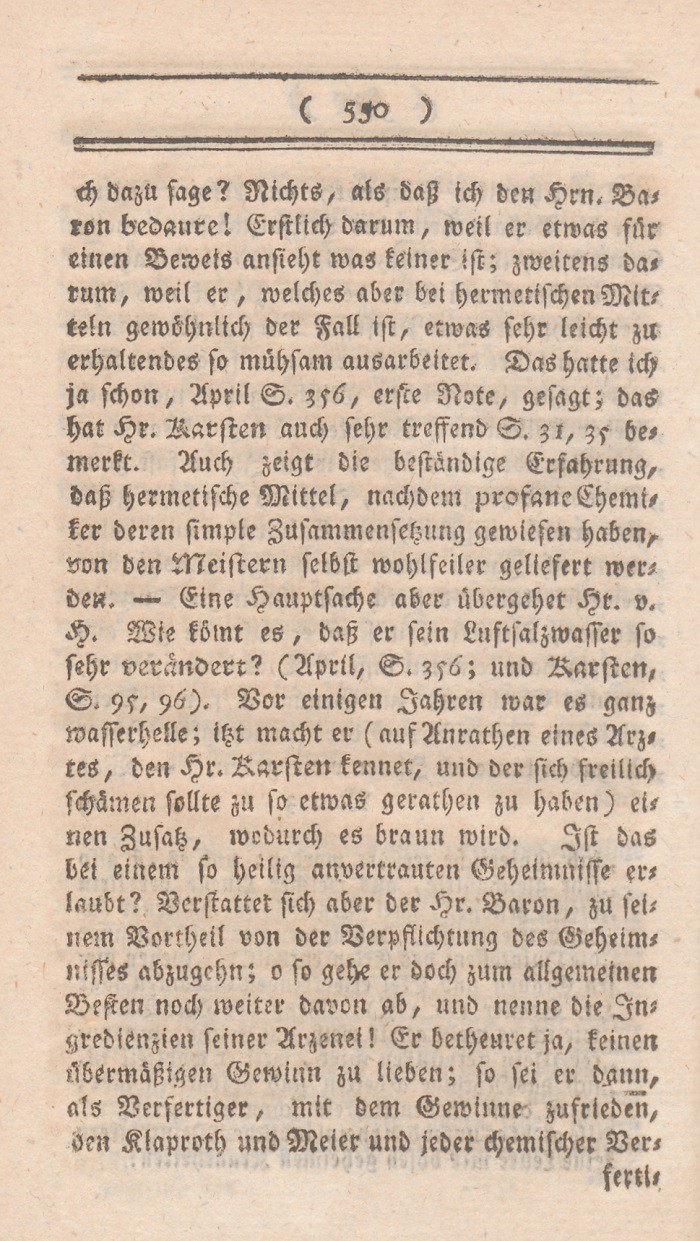 ich dazu sage? Nichts, als daß ich den Hrn Baron bedaure! Erstlich darum, weil er etwas für einen Beweis ansieht was keiner ist; zweitens darum, weil er, welches aber bei hermetischen Mitteln gewöhnlich der Fall ist, etwas sehr leicht zu erhaltendes so mühsam ausarbeitet. Das hatte ich ja schon, April S. 356, erste Note, gesagt; das hat Hr. Karsten auch sehr treffend S. 31, 35 bemerkt. Auch zeigt die beständige Erfahrung, daß hermetische Mittel, nachdem profane Chemiker deren simple Zusammensetzung gewiesen haben, von den Meistern selbst wohlfeiler geliefert werden. – Eine . 356; und Karsten, S. 95, 96). Vor einigen Jahren war es ganz wasserhelle; itzt macht er (auf Anrathen eines Arztes, den Hr. Karsten kennet, und der sich freilich schämen sollte zu so etwas gerathen zu haben) einen Zusatz, wodurch es braun wird. Ist das bei einem so heilig anvertrauten Geheimnisse erlaubt? Verstattt sich aber der Hr. Baron, zu seinem Vortheil von der Verpflichtung des Geheimnisses abzugehn; o so gehe er doch zum allgemeinen Besten noch weiter davon ab, und nenne die Ingredienzien seiner Arzenei! Er betheuret ja, keinen übermäßigen Gewinn zu lieben; so sei er dann, als Verfertiger, mit dem Gewinne zufrieden, den Klaproth und Meier und jeder chemischer Ver-
