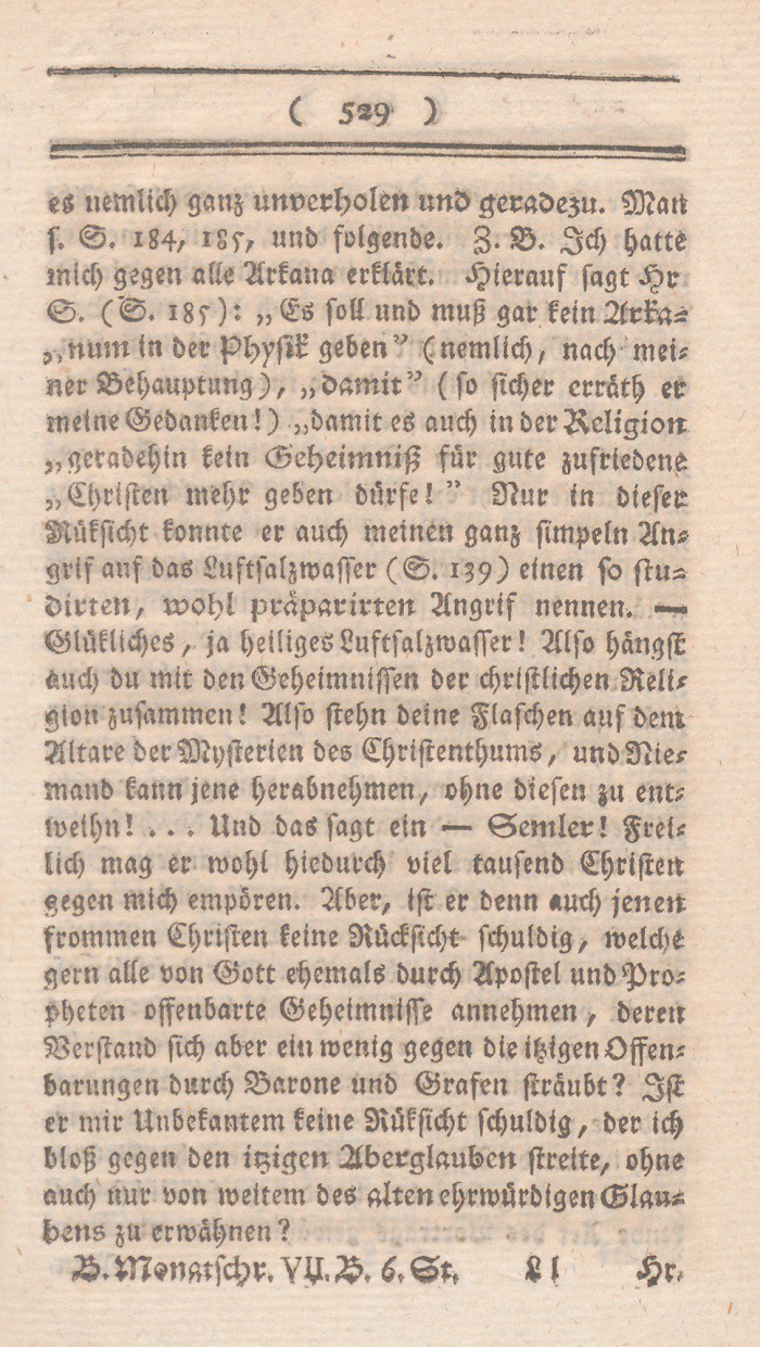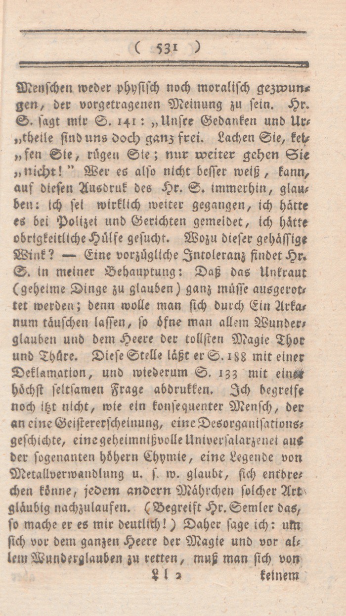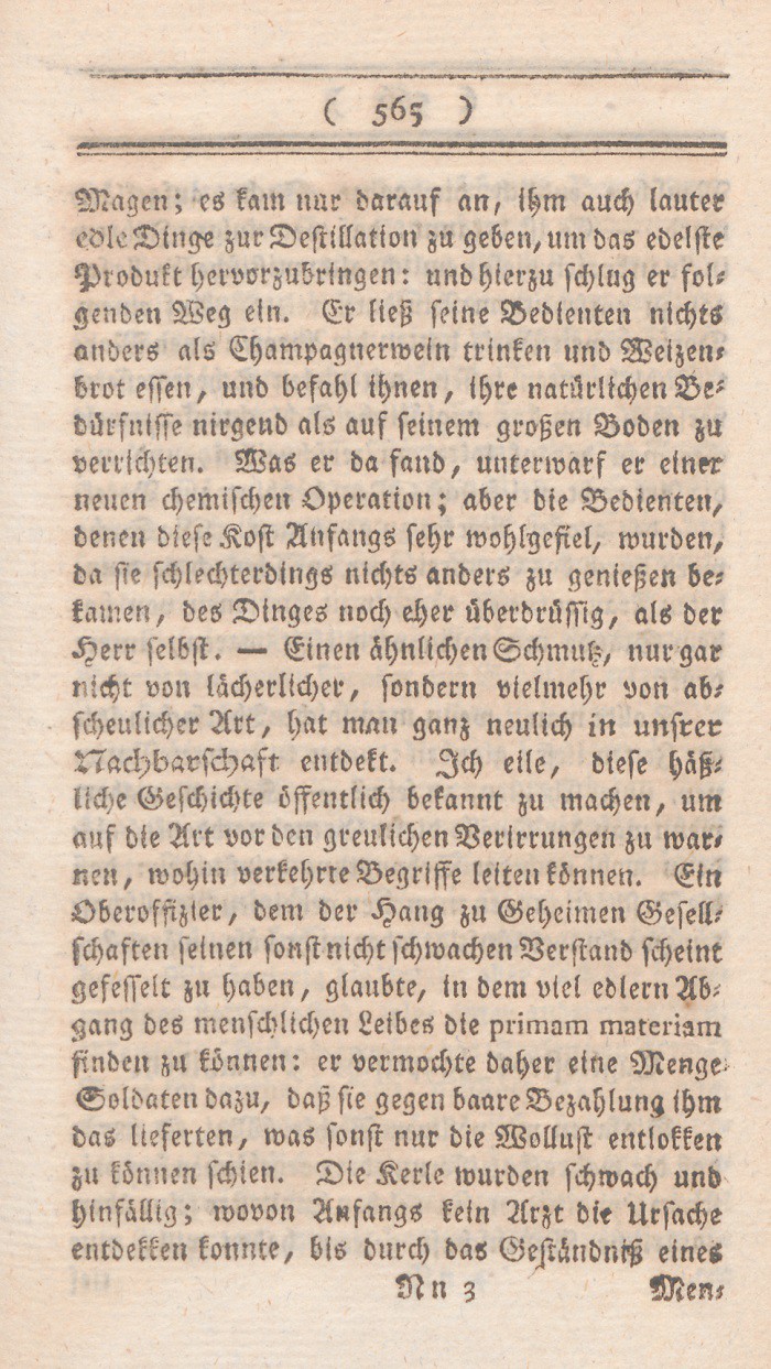 Magen; es kam nur darauf an, ihm auch lauter edle Dinge zur Destillation zu geben, um das edelste Produkt hervorzubringen; und hierzu schlug er folgenden Weg ein. Er ließ seine Bedienten nichts anders als Champagnerwein trinken und Weizenbrot essen, und befahl ihnen, ihre natürlichen Bedürfnisse nirgend als auf seinen großen Boden zu verrichten. Was er da fand, unterwarf er einer neuen chemischen Operation; aber die Bedienten, denen diese Kost Anfangs sehr wohlgefiel, wurden, da sie schlechterdings nichts anders zu genießen bekamen, des Dinges noch eher überdrüssig, als der Herr selbst. – Einen ähnlichen Schmutz, nur gar nicht von lächerlicher, sondern vielmehr von abscheulicher Art, hat man ganz neulich in unsrer Nachbarschaft entdekt. Ich eile, diese häßliche Geschichte öffentlich bekannt zu machen, und auf die Art vor den greulichen Verirrungen zu warnen, wohin verkehrte Begriffe leiten können. Ein Oberoffizier, dem der Hang zu Geheimen Gesellschaften senen sonst nicht schwachen Verstand scheint gefesselt zu haben, glaubte, in dem viel edlern Abgang des menschlichen Leibes die primam materiam finden zu können; er vermochte daher eine Menge Soldaten dazu, daß sie gegen baare Bezahlung ihm das lieferten, was sonst nur die Wollust entlokken zu können schien. Die Kerle wurden schwach und hinfällig; wovon Anfangs kein Arzt die Ursache entdekken konnte, bis durch das Geständniß eines