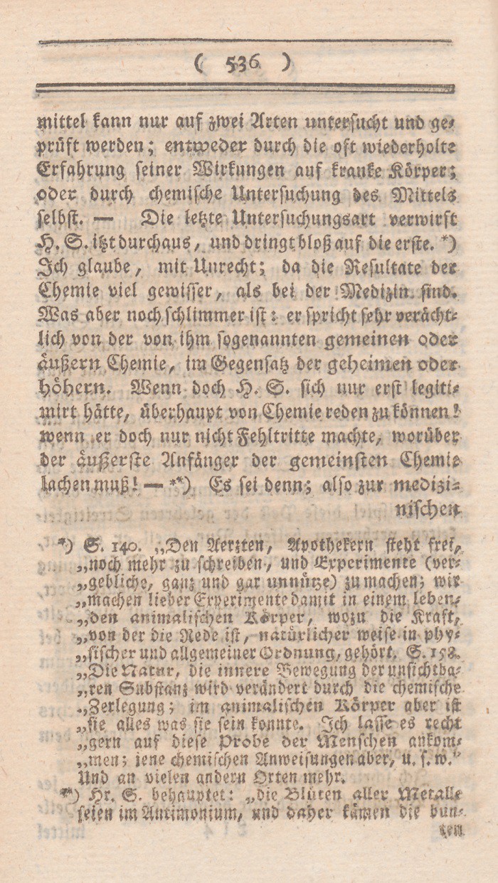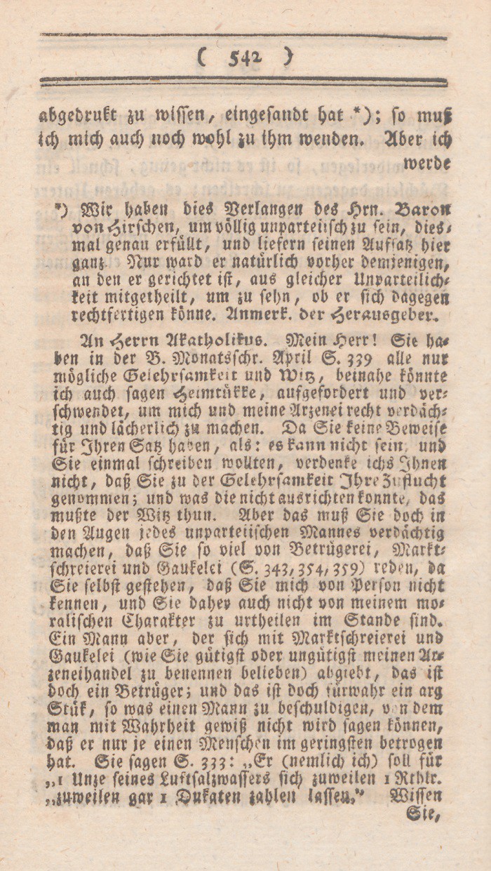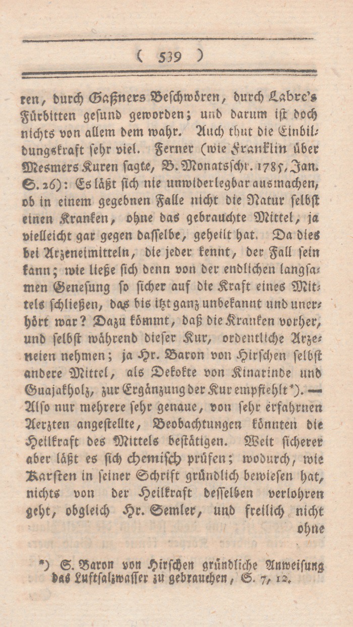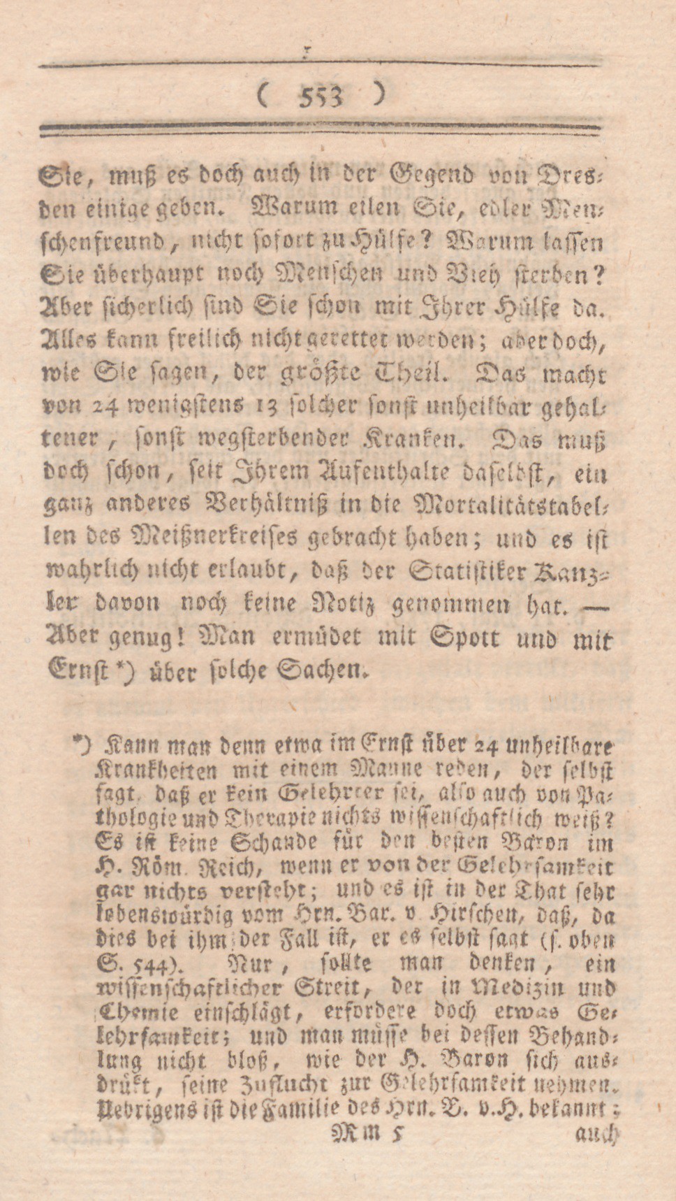 *) Kann man denn etwa im Ernst über 24 unheilbare Krankheiten mit einem Manne reden, der selbst sagt, daß er kein Gelehrter sei, also auch von Pathologie und Therapie nichts wissenschaftlich weiß? Es ist keine Schande für den besten Baron im H. Röm. Reich, wenn er von der Gelehrsamkeit gar nichts versteht; und es ist in der That sehr lobenswürdig von Hrn. Bar. v. Hirschen, daß, da dies bei ihm der Fall ist, er es selbst sagt (s. oben S. 544). Nur, sollte man denken, ein wissenschaftlicher Streit, der in Medizin und Chemie einschlägt, erfordere doch etwas Gelehrsamkeit; und man müsse bei dessen Behandlung nicht bloß, wie der H. Baron sich ausdrükt, seine Zuflucht zur Gelehrsamkeit nehmen. Uebrigens ist die Familie des Hrn. B.v.H. bekannt;
