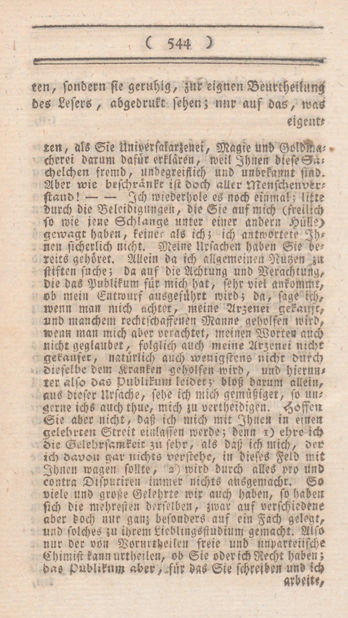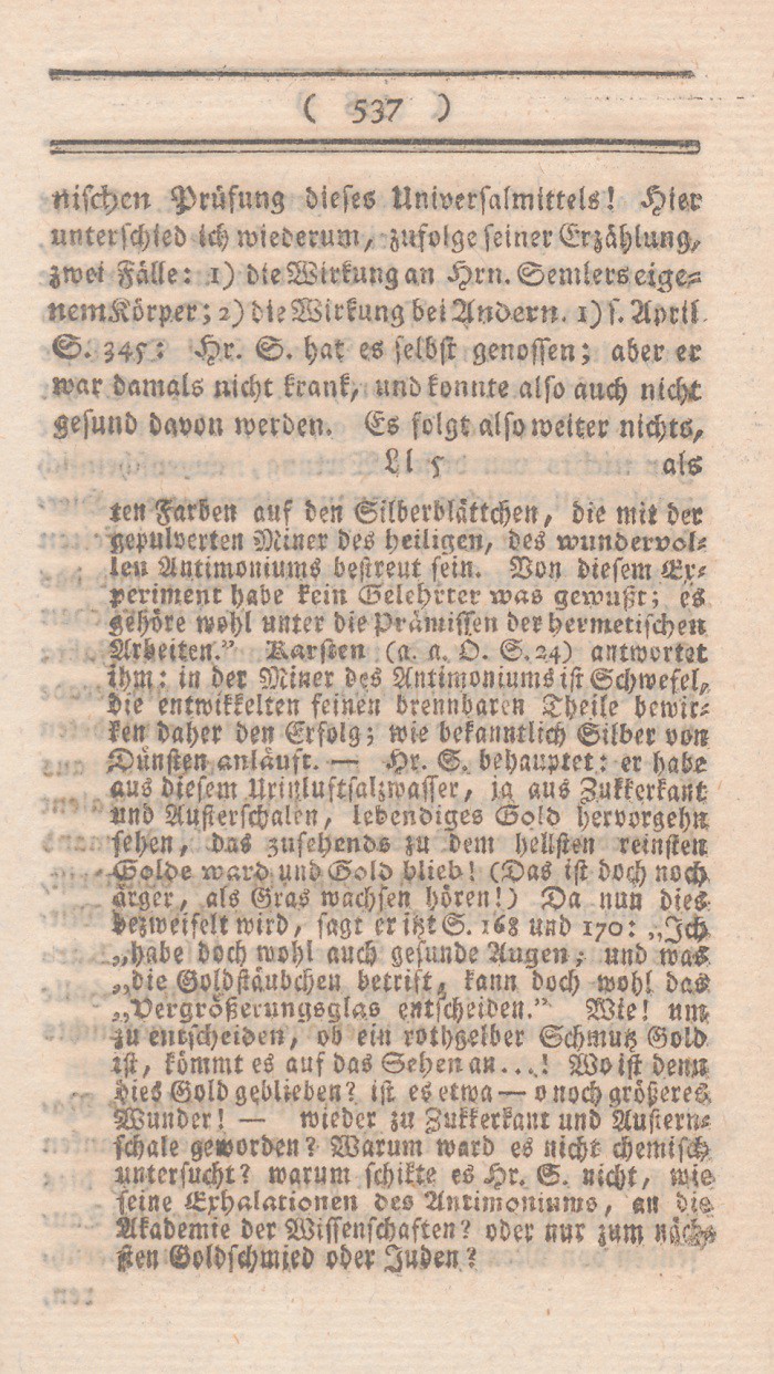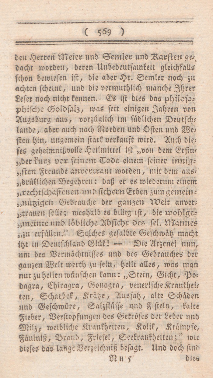den Herren Meier und Semler und Karsten gedacht worden, deren Unbedeutsamkeit gleich falls schon bewiesen ist, die aber Hr. Semler noch zu achten scheint, und die vermutlhlich manche Ihrer Leser noch nicht kennen. Es ist dies das philosophische Goldsalz, was seit einigen Jahren von Augsburg aus, vorzüglich im südlichen Deutschlande, aber auch nach Norden und Osten und Westen hin, ungemein stark verkauft wird. Auch dieses geheimnißvolle Heilmittel ist „von den Erfinderkurz vor seinem Tode einem seiner innigsten Freunde anvertraut worden, mit dem ausdrüklichen Begehren,: daß er es wiederum einem rechtschaffenen und sichern Erben zum gemeinnützigen Gebrauche der ganzen Welt anvertrauen solle; weshalb es billig ist, die wohlgemeinte und löbliche Absicht des Mannes zu erfüllen.“ Solches gesalbte Geschwätz macht itzt in Deutschland Glük! – Die Arzenei nun, um des Vermächtnisses und des Gebrauches der ganzen Welt werth zu sein, heilt alles, was man nur zu heilen wünschen kann: „Stein, Gicht, Podagra, Chiragra, Gonagra, venerische Krankheiten, Scharbok, Krätze, Ausatz, alte Schäden und Geschwüre, Salzflüsseund Fisteln, kalte Fieber, Verstopfungen und Gekröses der Leber und Milz, weibliche Krankheiten, Kolik, Krämpfe, Fäulniß, Brand, Friesel, Seekrankheiten;“ wie dieses lange Verzeichniß besagt. Und doch sind