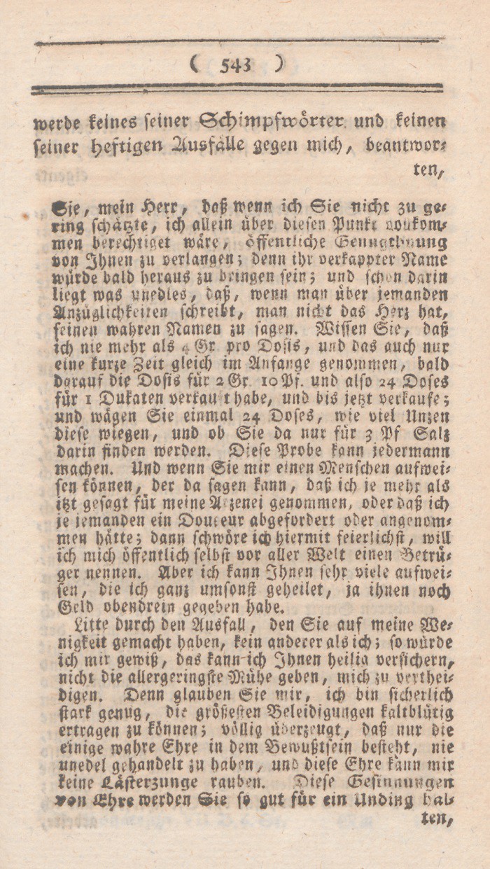 “Madam! Da ich durch mehrere sowohl öffentliche als Privatnachrichten, erfahren habe, daß Sie kürzlich viele wundervolle Kuren gethan haben, selbst wo es den besten Aerzten fehl geschla-
