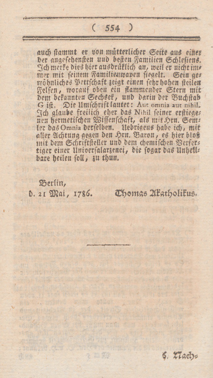 Berlin, d. 21 Mai, 1786. Thomas Akatholikus