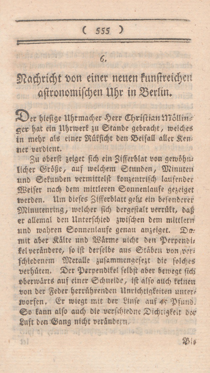 Der hiesige Uhrmacher Herr Christian Möllinger hat ein Uhrwerk zu Stande gebracht, welches in mehr als einer Rüksicht den Beifall aller Kenner verdient.