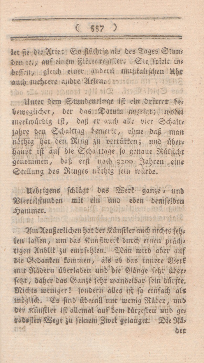 Am Aeußerlichen hat der Künstler auch nichts fehlen lassen, um das Kunstwerk durch einen prächtigen Anblik zu empfehlen. Man wird aber auf die Gedanken kommen, als ob das innere Werk mit Rädern überladen und die Gänge sehr übersetzt, daher das Ganze sehr wandelbar sein dürfte. Nichts weniger! sondern alles ist so einfach als möglich. Es sind überall nur wenig Räder, und der Künstler ist allemal auf dem kürzesten und geradesten Wege zu seinem Zwek gelanget. Die Rä-