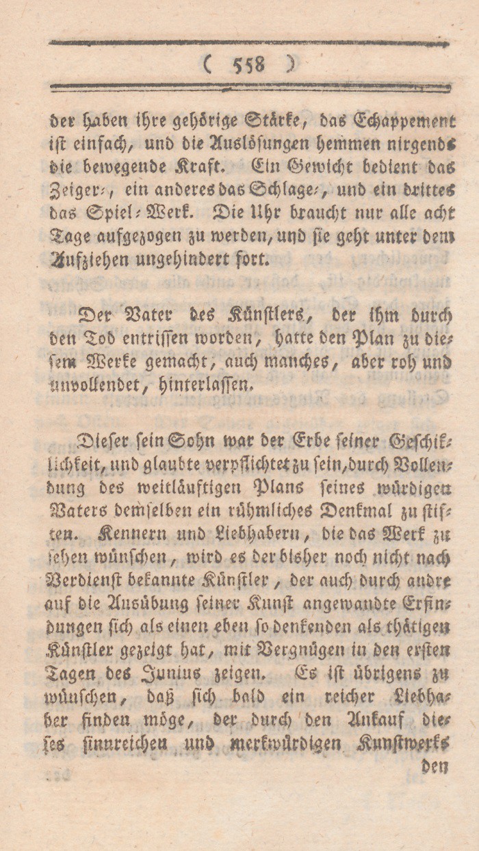 Dieser sein Sohn war der Erbe seiner Geschiklichkeit, und glaubte verpflichtet zu sein, durch Vollendung des weitläuftigen Plans seines würdigen Vaters demselben ein rühmliches Denkmal zu stiften. Kennern und Liebhabern, die das Werk zu sehen wünschen, wird es der bisher noch nicht nach Verdienst bekannte Künstler, der auch durch andre auf die Ausübung seiner Kunst angewandte Erfindungen sich als einen eben so denkenden als thätigen Künstler gezeigt hat, mit Vergnügen in den ersten Tagen des Junius zeigen. Es ist übrigens zu wünschen, daß sich bald ein reicher Liebhaber finden möge, der durch den Ankauf dieses sinnreichen und merkwürdigen Kunstwerks