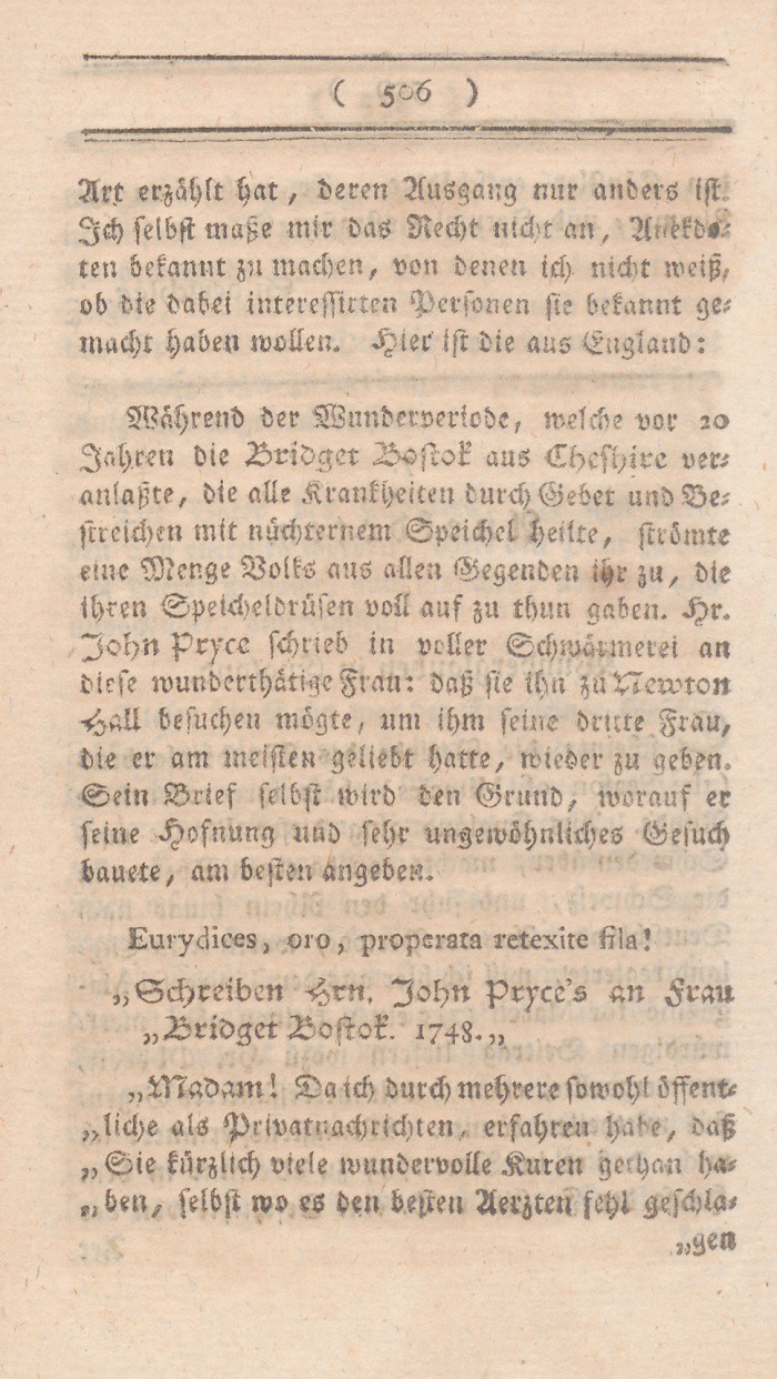 Während der Wunderperiode, welche vor 20 Jahren die Bridget Bostok aus Cheshire veranlaßte, die alle Krankheiten durch Gebet und Bestreichen mit nüchternem Speichel heilte, strömte eine Menge Volks aus allen Gegenden ihr zu, die ihren Speicheldrüsen voll auf zu thun gaben. Hr. John Pryce schrieb in voller Schwärmerei an diese wunderthätige Frau: daß sie ihn zu Newton Hall besuchen mögte, um ihm seine dritte Frau, die er am meisten geliebt hatte, wieder zu geben. Sein Brief selbst wird den Grund, worauf er seine Hofnung und sehr ungewöhnliches Gesuch bauete, am besten angeben.