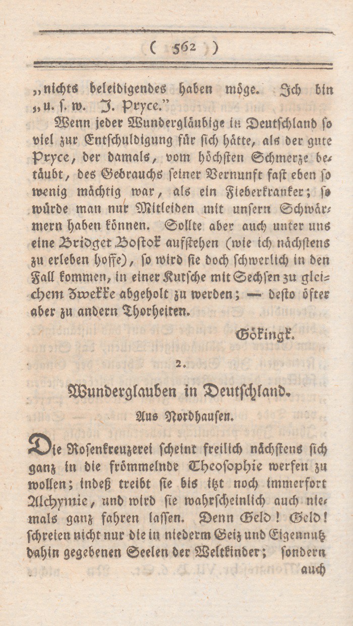 Wenn jeder Wundergläubige in Deutschland so viel zur Entschuldigung für sich hätte, als der gute Pryce, der damals, vom höchsten Schmerze betäubt, des Gebrauchs seiner Vernunft fast eben so wenig mächtig war, als ein Fieberkranker; so würde man nur Mitleiden mit unsern Schwärmern haben können. Sollte aber auch unter uns eine Bridget Bostok auferstehen (wie ich nächstens zu erleben hoffe), so wird sie doch schwerlich in den Fall kommen, in einer Kutsche mit Sechsen zu gleichem Zwecke abgeholt zu werden; – desto öfter aber zu andern Thorheiten. Gökingk.