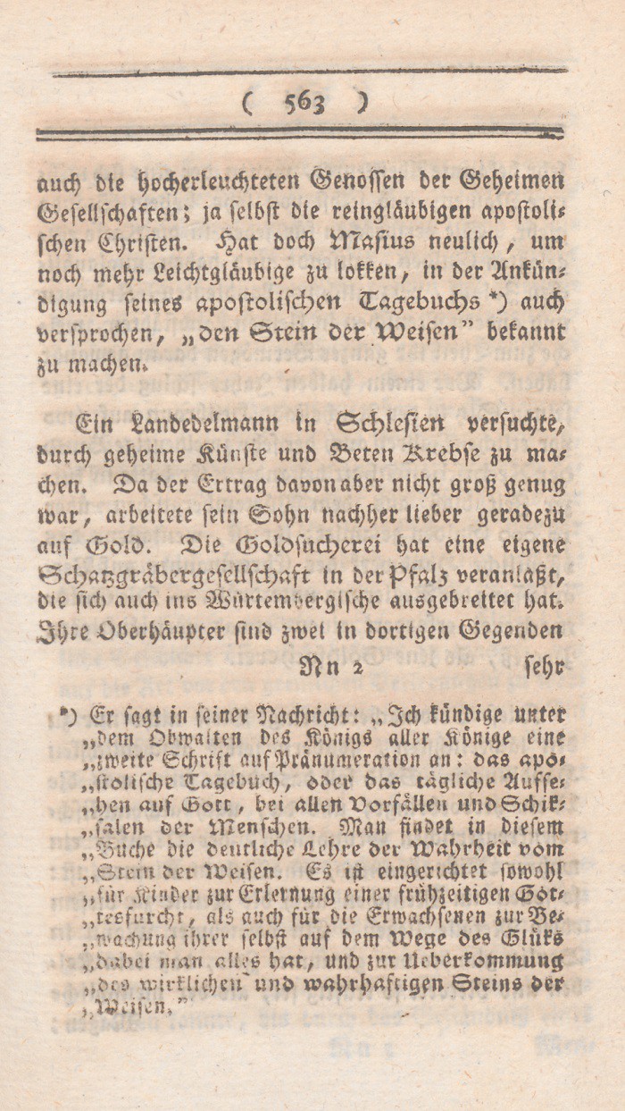 auch die hocherleuchteten Genossen der Geheimen Gesellschaften; ja selbst die reingläubigen apostolischen Christen. Hat doch Masius neulich, um noch mehr Leichtgläubige zu lokken, in der Ankündigung seines apostolischen Tagebuchs *) auch versprochen, „den Stein der Weisen“ bekannt zu machen.
