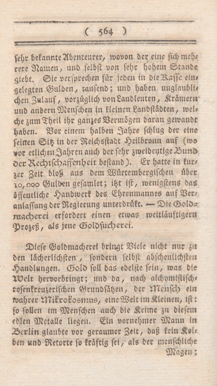 sehr bekannte Abenteurer, wovon der eine sich mehrere Namen, und selbst von sehr hohem Stande giebt. Sie versprechen für jeden in die Kasse eingelegten Gulden, tausend; und haben unglaublichen Zulauf, vorzüglich von Landleuten, Krämern und andern Menschen in kleinen Landstädten, welche zum Theil ihr ganzes Vermögen daran gewandt haben. Vor einem halben Jahre schlug der eine seinen Sitz in der Reichstadt Heilbronn auf (wo vor etlichen Jahren auch der sehr zweideutige Bund der Rechtschaffenheit bestand). Er hatte in kurzer Zeit bloß aus dem Würtembergischen über 10.000 Gulden gesamlet; itzt ist, wenigstens das öffentliche Handwerk des Ehrenmannes auf Veranlassung der Regierung unterdrükt. – Die Goldmacherei erfordert einen etwas weitläufigern Prozeß, als jene Goldsucherei.