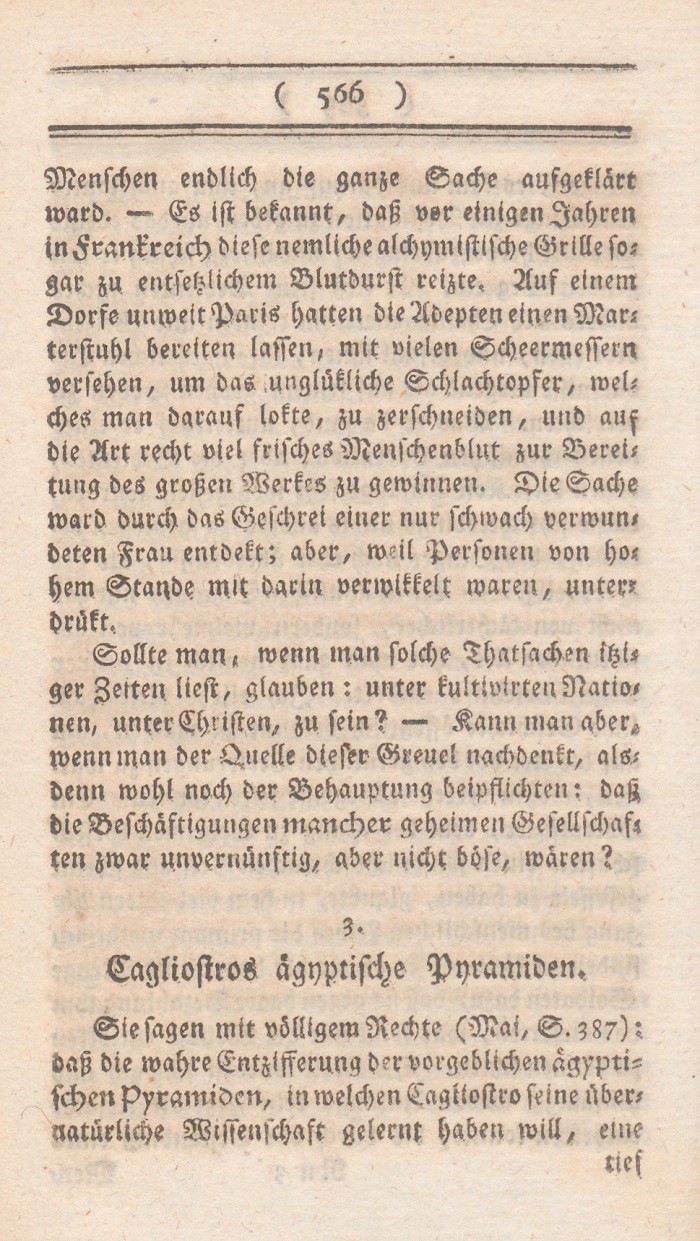 Sie sagen mit völligem Rechte (Mai, S. 387): daß die wahre Entzifferung der vorgeblichen ägyptischen Pyramiden, in welchen Cagliostro seine übernatürliche Wissenschaft gelernt haben will, eine