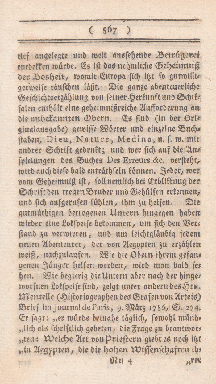 tief angelegte und weit aussehende Betrügerei entdekken würde. Es ist das nehmliche Geheimniß der Bosheit, womit Europa sich itzt so gutwilligerweise täuschen läßt. Die ganze abenteuerliche Geschichtserzählung von seiner Herkunft und Schiksalen enthält eine geheimnißreiche Aufforderung an die unbekannten Obern. Es sind (in der Originalausgabe) gewisse Wörter und einzelne Buchstaben, Dieu, Nature, Medina u.s.w. mit andrer Schrift gedrukt; und wer sich auf die Anspielungen des Buches Des Erreurs & c. versteht, wird auch diese bald anträthseln können. Jeder, wer vom Geheimniß ist, soll nemlich bei Erblikkung der Schrift den treuen Bruder und Gehülfen erkennen, und sich aufgerufen fühlen, ihm zu helfen. Die gutmüthigen betrogenen Untern hingegen haben wieder eine Lokspeise bekommen, um sich den Verstand zu verwirren, und um leichtgläubig jedem neuren Abenteurer, der von Aegypten zu erzählen weiß, nachzulaufen. Wie die bern ihrem gefangenen Jünger helfen werden, wird man bald sehen. Wie begierig die Untern aber nach der hingeworfenen Lokspeise sind, zeigt unter andern des Hrn. Mentelle (Historiographen des Grafen von Artois) Brief im Journal de Paris, 9. März 1786, S. 274 Er sagt: „er würde beinahe täglich, sowohl mündlich als auch schriftlich gebeten, die Frage zu beantworten: Welche Art von Priestern giebt es noch itzt in Ägypten, die die hohen Wissenschaften ih-