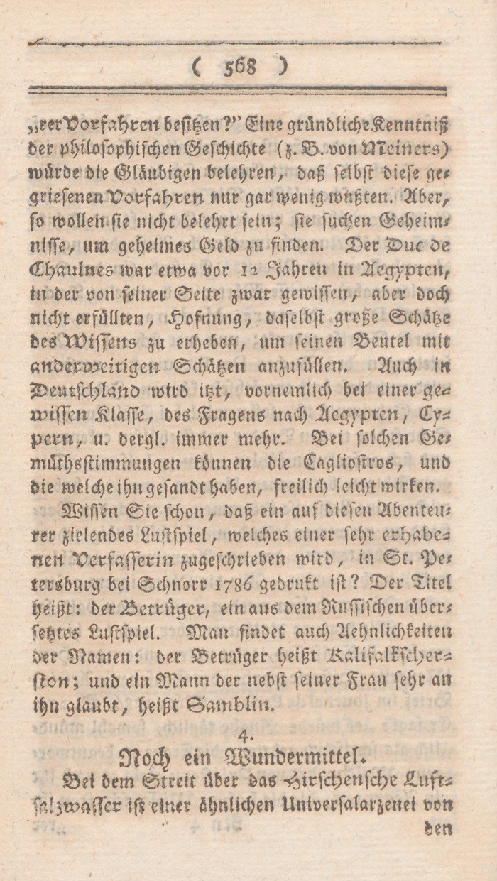 Wissen Sie schon, daß ein auf diesen Abenteurer zielendes Lustspiel, welches einer sehr erhabenen Verfasserin zugeschrieben wird, in St. Petersburg bei Schnorr 1786 gedrukt ist? Der Titel heißt: der Betrüger, ein aus dem Russischen übersetztes Lustspiel. Man findet auch Aehnlichkeiten der Namen: der Betrüger heißt Kalifalkscherston; und ein Mann der nebst seiner Frau sehr an ihn glaube, heißt Samblin.