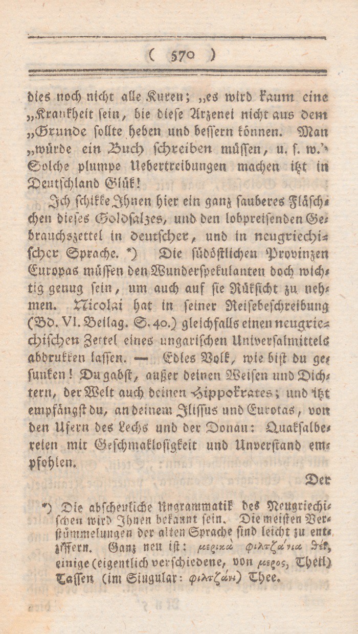 Ich schikke Ihnen hier ein ganz sauberes Fläschchen dieses Goldsalzes, und den lobpreisenden Gebrauchszettel in deutscher und in neugriechischer Sprache. *) Die südöstlichen Provinzen Europas müssen den Wunderspekulanten doch wichtig genug sein, um auch auf sie Rüksicht zu nehmen. Nicolai hat in seiner Reisebeschreibung (Bd. VI. Beilag. S. 40) gleichfalls einen neugriechischen Zettel eines ungarischen Universalmittels abdrukken lassen. – Edles Volk, wie bist du gesunken! Du gabst, außer Deinen weisen und Dichtern, der Welt auch deinen Hippokrates; und itzt empfängst du, an deinem Ilissus und Eurotas, von den Ufern des Lechs und der Donau: Quaksalbereien mit Geschmaklosigkeit und Unverstand empfohlen.