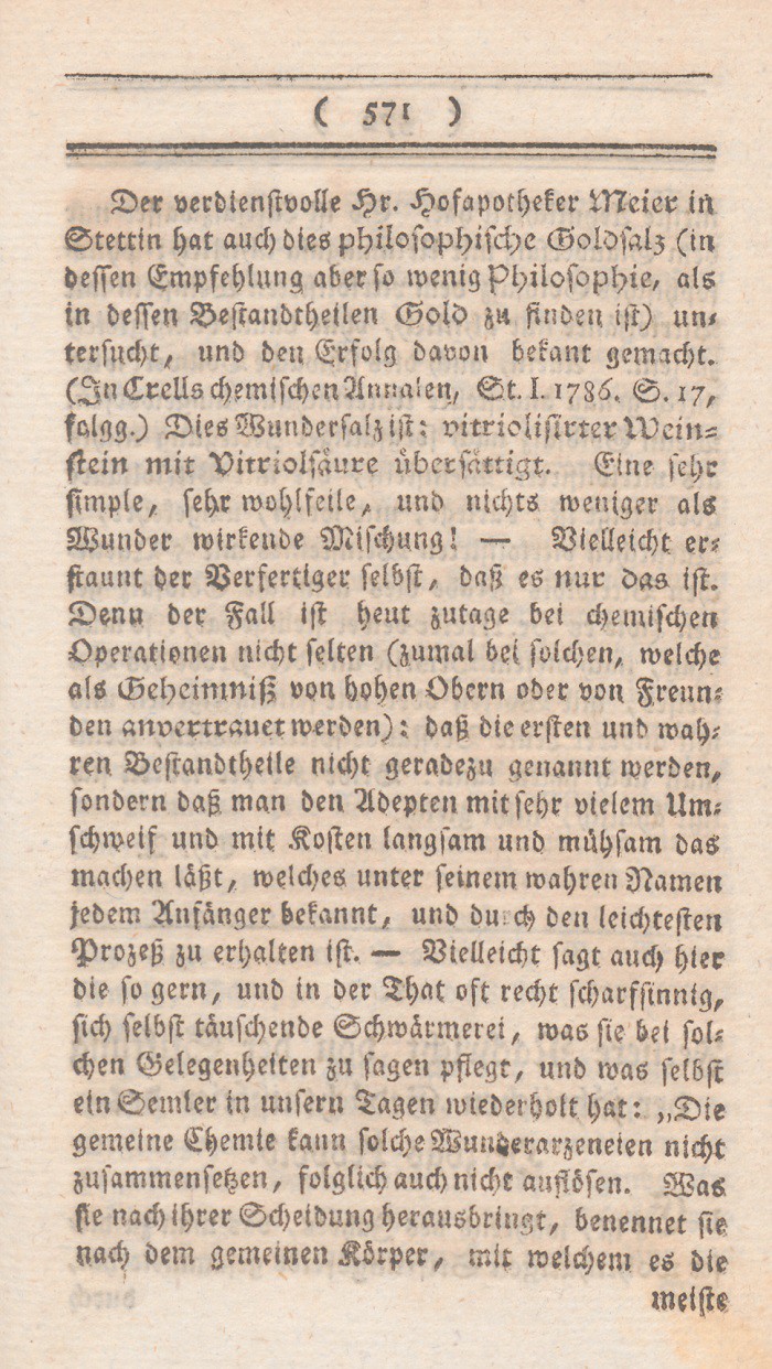 Der verdienstvolle Hr. Hofapotheker Meier in Stettin hat auch dies philosophische Goldsalz (indessen Empfehlung aber so wenig Philosophie, als in dessen Bestandtheilen Gold zu finden ist) untersucht, und den Erfolg davonbekant gemacht. (In Crells chemischen Annalen, St. I 1786, S. 17 folgg.) Dies Wundersalz ist: vitriolisirter weinstein mit Vitriolsäure übersättigt. Eine sehr simple, sehr wohlfeile, und nichts weniger als Wunder wirkende Mischung! – Vielleicht erstaunt der Verfertiger selbst, daß es nur das ist. Denn der Fall ist heut zutage bei chemischen Operationen nicht selten (zumal bei solchen, welche als Geheinmniß von hohen Obern oder von Freunden anvertrauet werden): daß die ersten und wahren Bestandteile nicht geradezu genannt werden, sondern daß man den Adepten mit sehr vielem Umschweif und mit Kosten langsam und mühsam das machen läßt, welches unter seinem wahren Namen jedem Anhänger bekannt, und durch den leichtesten Prozeß zu erhalten ist. – Vielleicht sagt auch hier die so gern, und in der That oft scharfsinnig, sich selbst täuschende Schwärmerei, was sie bei solchen Gelegenheiten zu sagen pflegt, und was selbst ein Semler in unsern Tagen wiederholt hat: „Die gemeine Chemie kann solche Wunderarzeneien nicht zusammensetzen, folglich auch nicht auflösen. Was sie nach ihrer Scheidungherausbringt, benennet sie nach dem gemeinen Körper, mit welchem es die