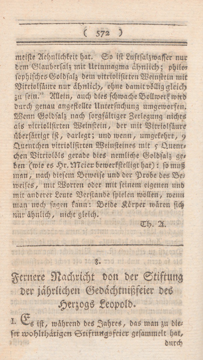 meiste Aehnlichkeit hat. So ist Luftsalzwasser nur dem Glaubersalz mit Urinmagma ähnlich; philosophisches Goldsalz dem vitriolisirten Weinstein mit Vitriolsäure nur ähnlich, ohne damit völlig gleich zu sein.“ Allein, auch dies schwache Bollwerk wird durch genau angestellte Untersuchung umgeworfen. Wenn Goldsalz nach sorgfältiger Zerlegung nichts als vitriolisirten Weinstein, der mit Vitriolsäure übersättigt ist, darlegt; und wenn, umgekehrt, 9 Quentchen vitriolisirten Weinsteines mit 5 Quentchen Vitriodis gerade dieses nemliche Goldsalz geben (wie es Hr. Meier bewerkstelligt hat): so muß man, nach diesem Beweise und der Probe des Beweises, mit Worten oder mit seinem eigenen und mit anderer Leute Verstande spielen wollen, wenn man noch sagen kann: Beide Körper wären sich nur ähnlich, nicht gleich.