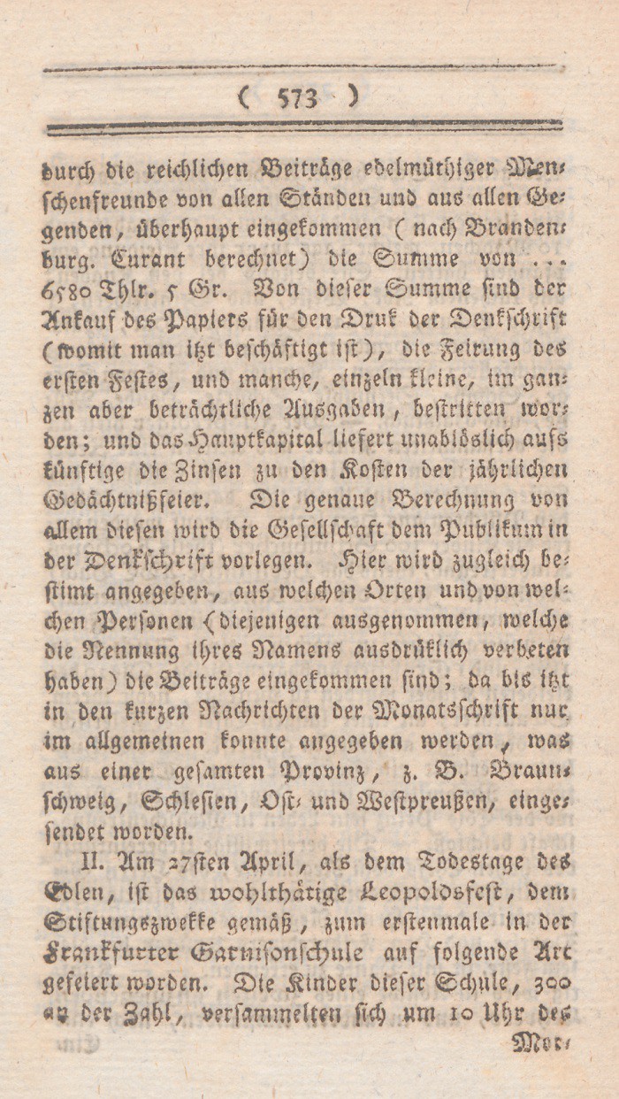 II. Am 27. April, als dem Todestage des Edlen, ist das wohlthätige Leopoldsfest, dem Stiftungszwekke gemäß, zum erstenmale in der Frankfurter Garnisonschule auf folgende Art gefeiert worden. Die Kinder dieser Schule, 300 an der Zahl, versammelten sich um 10 Uhr des
