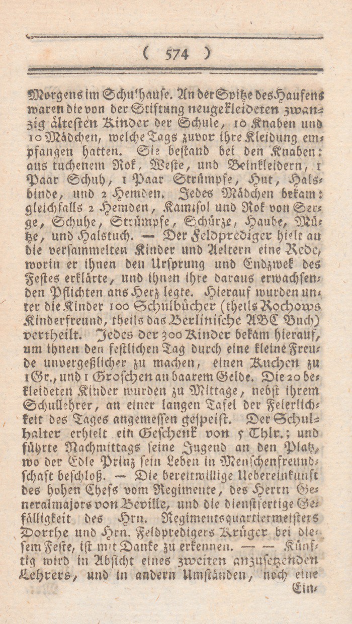 Morgens im Schulhause. An der Spitze des Haufens waren die von der Stiftung neugekleideten zwanzig ältesten Kinder der Schule, 10 Knaben und 10 Mädchen, welche Tags zuvor ihre Kleidung empfangen hatten. Sie bestand bei den Knaben: aus tuchenem Rok, Weste, und Beinkleidern, 1 Paar Schuh, 1 Paar Strümpfe, Hut, Halsbinde, und 2 Hemden. Jedes Mädchen bekam: gleichfalls 2 Hemden, Kamisol und Rok von Serge, Schuhe, Strümpfe, Schürze, Haube, Mütze und Halstuch. – DerFeldprediger hielt an die versammelten Kinder und Aeltern eine Rede, worin er ihnen den Ursprung und Endzwek des Festes erklärte, und ihnen ihre daraus erwachsenden Pflichten ans Herz legte. Hierauf wurden unter die Kinder 100 Schulbücher (theils Rochows Kinderfreund, theils das Berlinische ABC Buch) vertheilt. Jedes der 300 Kinder bekam hierauf, um ihnen den festlichen Tag durch eine kleine Freude unvergeßlicher zu machen, einen Kuchen zu 1 Gr., und 1 Groschen an baarem Gelde. Die 20 bekleideten Kinder wurden zu Mittage, nebst ihrem Schullehrer, an einer langen Tafel der Feierlichkeit des Tages Tages angemessen gespeist. Der Schulhalter erhielt ein Geschenk von 5 Thlr; und führte Nachmittags seine Jugend an den Platz, wo der Edle Prinz sein Leben in Menschenfreundschaft beschloß. – Die bereitwillige Uebereinkunft des hohen Chefs vom Regimente, des Herrn Generalmajors von Beville, und die dienstfertige Gefälligkeit des Hrn. Regimentsquartiermeisters Dorthe und Hrn. Feldpredigers Krüger bei diesem Feste, ist mit Danke zu erkennen. – Künftig wird in Absicht eines zweiten anzusetzenden Lehrers, und in andern Umständen, noch eine