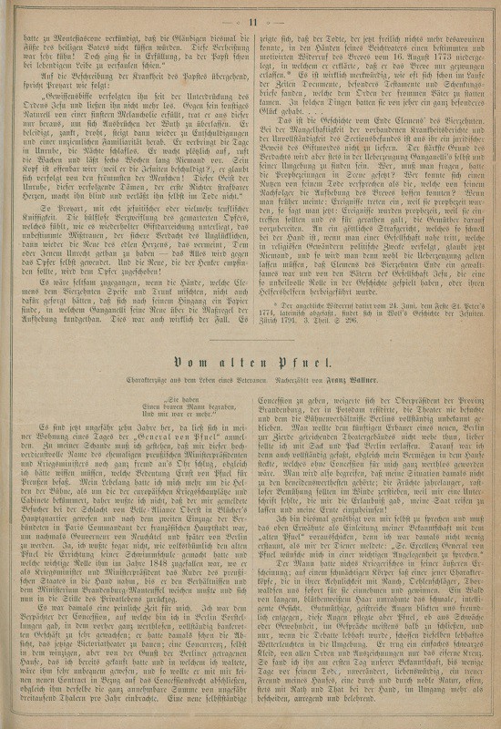 Es sind jetzt ungefähr zehn Jahre her, da ließ sich in meiner Wohnung eines Tages der „General von Pfuel“ anmelden. Zu meiner Schande muß ich gestehen, daß mir dieser hochverdienstvolle Name des ehemaligen preußischen Ministerpräsidenten und Kriegsministers noch ganz fremd an’s Ohr schlug, obgleich ich hätte wissen müssen, welche Bedeutung Ernst von Pfuel für Preußen besaß. Mein Lebelang hatte ich mich mehr um die Helden der Bühne, als um die der europäischen Kriegsschauplätze und Cabinete bekümmert, daher wußte ich nicht, daß der mir gemeldete Besucher bei der Schlacht von Belle-Aliance Oberst in Blücher’s Hauptquartier gewesen und nach dem zweiten Einzuge der Verbündeten in Paris Commandant der französischen Hauptstadt war, um nachmals Gouverneur von Neuchâtel und später von Berlin zu werden. Ja, ich wußte sogar nicht, wie volksthümlich den alten Pfuel die Errichtung seiner Schwimmschule gemacht hatte und welche wichtige Rolle ihm im Jahre 1848 zugefallen war, wo er als Kriegsminister und Ministerpräsident das Ruder des preußischen Staates in die Hand nahm, bis er den Verhältnissen und dem Ministerium Brandenburg-Manteuffel weichen mußte und sich nun in die Stille des Privatlebens zurückzog.