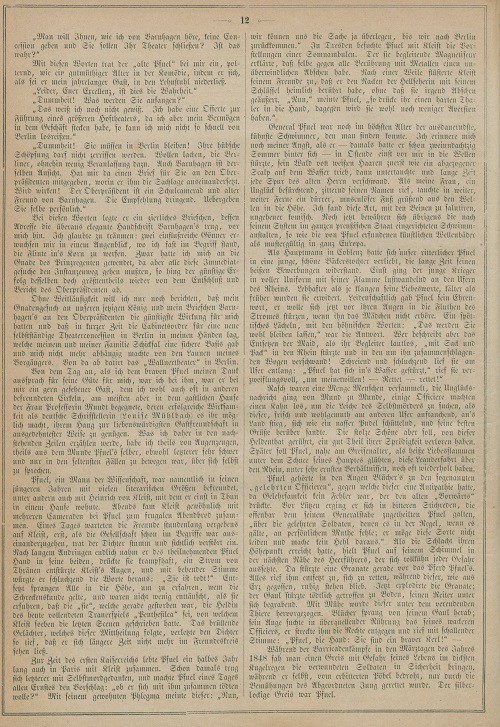 Von dem Tag an, als ich dem braven Pfuel meinen Dank aussprach für seine Güte für mich, war ich bei ihm, war er bei mir ein gern gesehener Gast, dem ich wohl auch oft in anderen befreundeten Cirkeln, am meisten aber in dem gastlichen Hause der Frau Professorin Mundt begegnete, deren erfolgreiche Wirksamkeit als deutsche Schriftstellerin (Louise Mühlbach) es ihr möglich macht, ihrem Hang zur liebenswürdigsten Gastfreundschaft in ausgedehntester Weise zu genügen. Was ich daher in den nachstehenden Zeilen erzählen werde, habe ich theils von Augenzeugen, theils aus dem Munde Pfuel’s selber, obwohl letzterer sehr schwer und nur in den seltensten Fällen zu bewegen war, über sich selbst zu sprechen.