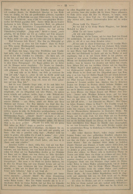 „Es war auch an einem Sommertage, als der deutsche Maler wieder einmal, wie so oft, das Grab des Salvator Rosa besuchte in der Kirche des Michel Angelo bei den Thermen des Diocletian, die man Maria degli Angeli nennt. Dort sann er am liebsten nach über das Geheimniß der Farbe und wie der Meister es wohl angefangen, daß er sie mit seinem Pinsel so fest gehalten und warum es dem armen Deutschen nicht gelingen sollte. Und die Mönche des Karthäuserklosters neben der Kirche grüßten freundlich herüber, denn sie kannten den Fremden und hatten ihm erlaubt, ihren schönen Hof mit den dorischen Säulen und den Cypressen, die Michel Angelo’s Hand gepflanzt, zu zeichnen. An der Mauer des Klostergartens rankten weiße Rosen empor, und solch’ eine weiße Blume in der Hand und sein Skizzenbuch unter dem Arm, ging er an dem Tage des fünften August fort aus seinem Friedensversteck, mit dem Vorsatz, einmal eine Osteria zu besuchen und ein Glas feurigen Orvieto’s zu trinken. Als er aber an der Fontana de’ Termini vorüber kam, schnitten ihm die steinernen Fratzen des Prosper da Brescia allerlei seltsame Gesichter und streckten ihre Riesenarme aus, ihn festzuhalten. Er eilte jedoch nur um so schneller vorwärts, der lieblichen Kirche Maria Maggiore zu, deren Pforten eine Schaar Frauen und Männer eben belagerte. Immer mehr Menschen strömten herzu, und der junge Maler fragte endlich einen Mönch, der eben daher schritt, ob man dort ein Fest feiere. Die Antwort lautete: ‚Man begeht heut das Fest ad nives, – das Schneefest der Maria!‘ Aber Schnee im hohen Sommer, Schnee in Rom?! Der Deutsche vergaß seinen Orvieto und trat in die heiligen Hallen. Weihrauchduft wallte ihm entgegen, eine süße Dämmerung füllte die drei Schiffe, nur die Marmorsäulen schimmerten in blendender Weiße. Am Altar leuchteten aber zahllose Kerzen neben der Gestalt der Himmelskönigin und die reiche Decke des San Gallo mit den Arabesken des Giotto hing wie ein golddurchwirkter Schleier über ihm. Er trat an die herrliche Capelle der Sforza, die fast im Dunkeln lag, kaum unterschieden seine Augen die Umrisse einer Frauengestalt, die vor dem Seitenaltar kniete. Ein greiser Priester erzählte eben der andachtsvollen Menge die Entstehung der Kirche Maria Maggiore in schlichter Rede.