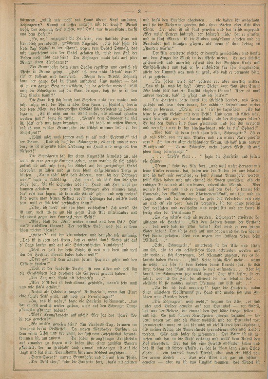 „No, no,“ entgegnete die Hauserin, eine stattliche Frau mit freundlich gerundetem, geröthetem Angesicht. „Ich hab’ schon die letzte Lag’ Küchel in der Pfann’; wegen dem Bröckel Schmalz, das mir unversehens von der Gabel gefallen ist, wird dem Faß der Boden noch nicht aus sein! Der Schwager macht halt aus jeder Mucken einen Elephanten!“