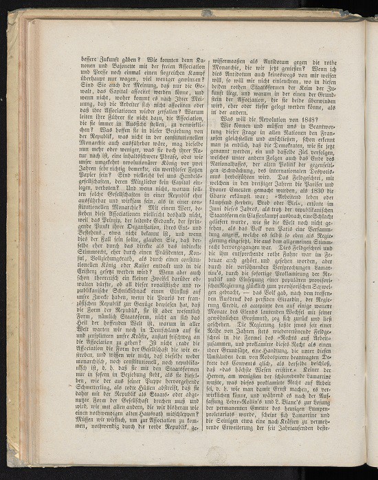 ... bessere Zukunft gäben? Wie konnten denn Kanonen und Bajonette mit der freien Association und Presse noch einmal einen siegreichen Kampf überhaupt nur wagen, viel weniger gewinnen? Sind Sie auch der Meinung, daß nur die Gewalt, das Capital associirt werden könne, und wenn nicht, woher kommt es nach Ihrer Meinung, daß die Arbeiter sich nicht associiren oder das ihre Associationen wieder zerfallen? Warum leiten ihre Führer sie nicht dazu, die Association, die sie immer in Aussicht stellen, zu verwirklichen? Was hoffen sie in dieser Beziehung von der Republik, was nicht in der constitutionellen Monarchie auch ausführbar wäre, mag dieselbe nun mehr oder weniger, was sie doch ihrer Natur nach ist, eine inhaltsschwere Phrase, oder wie unser umgekehrt revolutionärer König vor zwei Jahren sehr richtig bemerkte, ein werthloser Fetzen Papier sein? Sind vielleicht bei uns Handelsgesellschaften, deren Mitglieder kein Capital einlegen, verboten? Und wenn nicht, warum sollten solche Gesellschaften in einer Republik eher ausführbar und wirksam sein, als in einer constitutionellen Monarchie? Mit einem Wort, bestehen diese Associationen vielleicht deshalb nicht, weil das Prinzip, der leitende Gedanke, der springende Punkt ihrer Organisation, ihres Ent- und Bestehens, etwa nicht bekannt ist, und wenn dies der Fall sein sollte, glauben Sie, daß derselbe eher durch das direkte als das indirekte Stimmrecht, eher durch einen Präsidenten, Konsul, Vollziehungsrath, als durch einen cnstitutionellen König oder Kaiser entdeckt und in die Existenz gesetzt werden wird? Wenn aber auch schon theoretisch ein kleiner Zweifel darüber obwalten dürfte, ob all dieser royalistische und republikanische Schnickschnack einen Einfluß auf unsre Zwecke haben, wenn die Praxis der französischen Republik zur Genüge bewiesen hat, daß die Form der Republik, sie ist aber wesentlich Form, nämlich Staasform, nicht an sich das Heil der hoffenden Welt ist, warum in aller Welt warten wir noch in Deutschland auf sie und zersplittern unsere Kräfte, anstatt frischweg an die Assocation zu gehen? Ist nicht grade die Assoziation die Form der Gesellschaft die wir erstreben, und wissen wir nicht, daß dieselbe weder monarchisch, noch constitutionell, noch republikanisch ist, d.h. daß sie mit den Staatsformen nur insofern in Beziehung steht, als sie dieselben, wie der aus seiner Puppe hervorgehende Schmetterling, als todte Hüllen abstreift, daß sie daher mit der Republik als Staats- oder abgenutzte Form der Gesellschaft brechen muß und wird, wie mit allen andern, die wir bisheran wie einen nothwendigen alten Hausrath mitschleppen? Müssen wir wirklich, um zur Association zu kommen, nothwendig durch die rothe Republik, gewissermaßen als Antidotum gegen die rothe Monarchie, die wir jetzt genießen? Wenn ich dies Antidotum auch keineswegs von mir weisen will, so will mir nicht einleuchten, wo in diesen beiden rothen Staatsformen der Keim der Zukunft liegt, und warum in der einen der Grundstein der Association, die sie beide überwinden wird, eher oder tiefer gelegt werden könne, als in der andern.