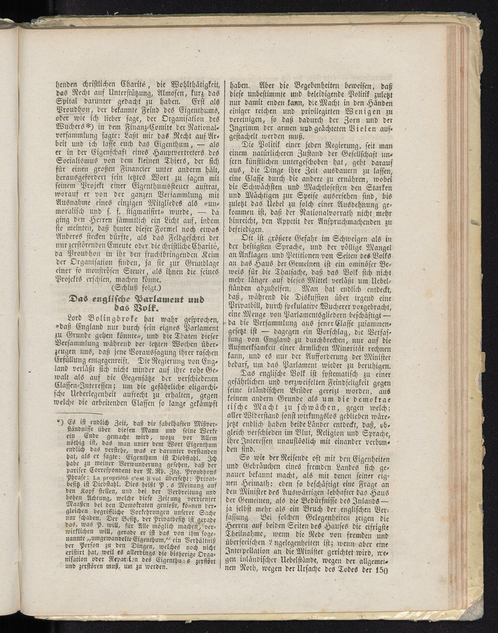 **) Es ist endlich Zeit, daß die fabelhaften Mißverständnisse über diesen Mann und seine Werke ein Ende gemacht wird, wozu vor Allem nöthig ist, das man unter dem Wort Eigenthum endlich das verstehe, was er darunter verstanden hat, als er sagte: Eigenthum ist Diebstahl. Ich habe zu meiner Verwunderung gesehen, daß der pariser Correspondent der R.Rb.Ztg. Proudhens Phrase: La propriété c´est li vol übersetzt: Privatbesitz ist Diebstahl. Dies heißt P.s Meinung auf den Kopf stellen, und bei der Verbreitung und hohen Achtung, welche diese Zeitung verdienter Maaßen bei den Demokraten genießt, können dergleichen begriffliche Vorkehrungen unserer Sache nur schaden. Der Besitz, der Privatbesitz ist gerade das, was P. will, für Alle möglich machen, verwirklichen will, gerade er ist das von ihm sogenannte „umgewandelte Eigenthum“, ein Verhältniß der Person zu den Dingen welches noch nicht existirt hat, weil es allerdings die bisherige Organisation oder Reparation des Eigenthums zerstört und zerstören muß, um zu werden.