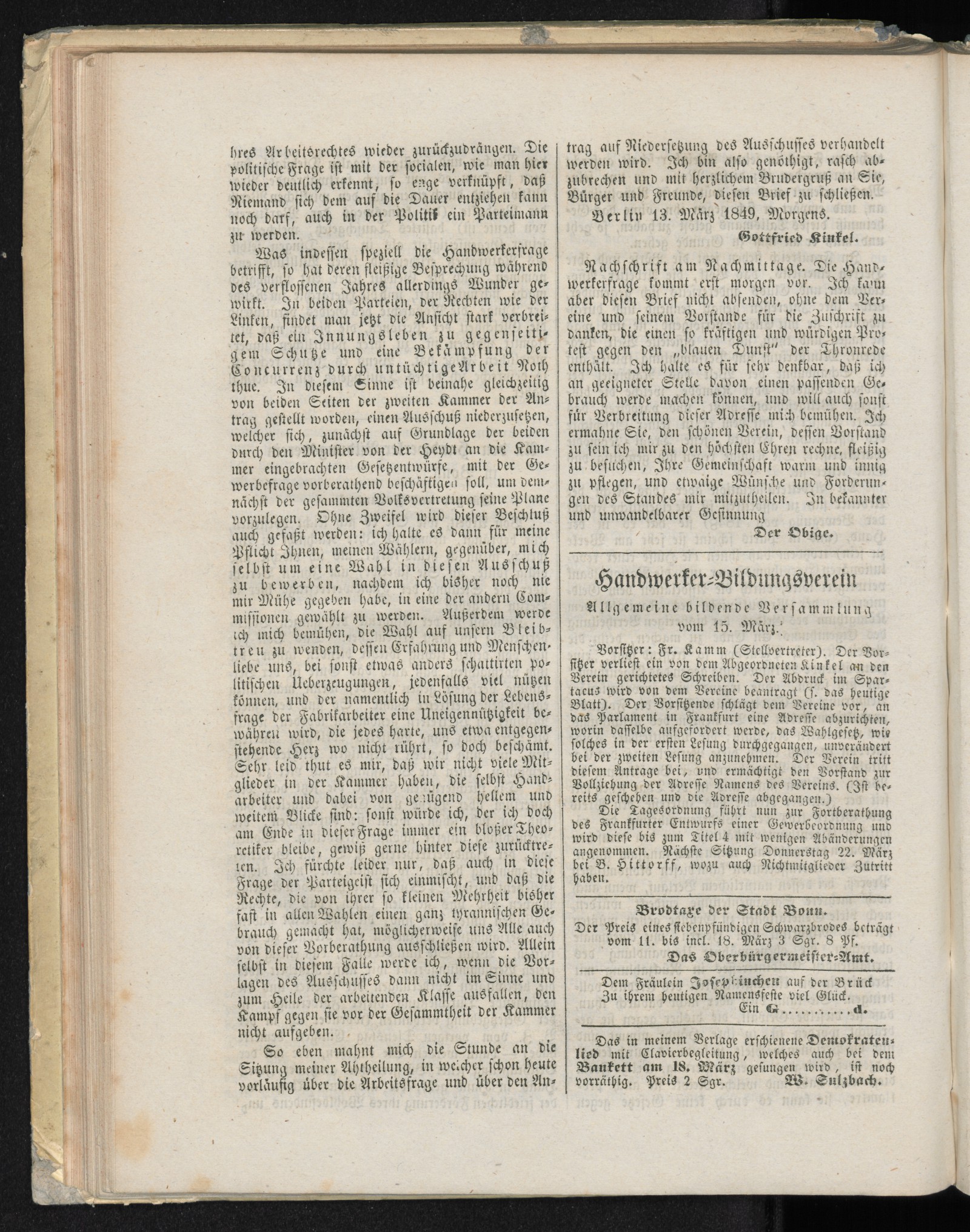 Der Vorsitzende, Fr. Kamm (Stellvertreter), eröffnet die Sitzung mit der Erklärung, daß das in der Sitzung beschlossene Schreiben an die Abgeordneten der Kreise Bonn und Sieg durch den Vorstand vollzogen und abgesandt sei, der von dem Abgeordneten Kinkel an den demokratischen Verein gerichteten Brief, wird mit großem Beifall aufgenommen.